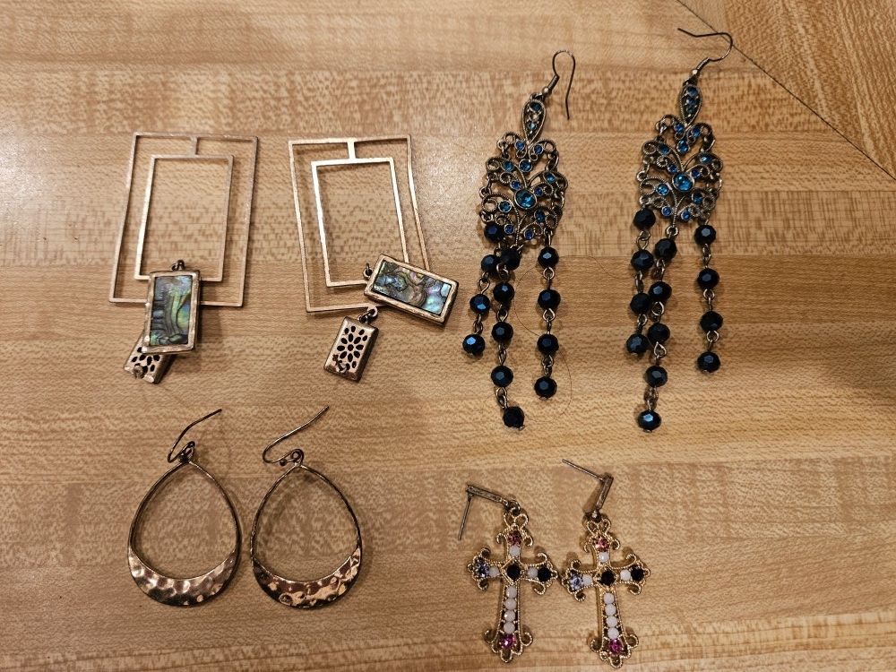 Selling a collection of earrings! There are a few different styles, including teardrop and cross earrings. They are in good condition.