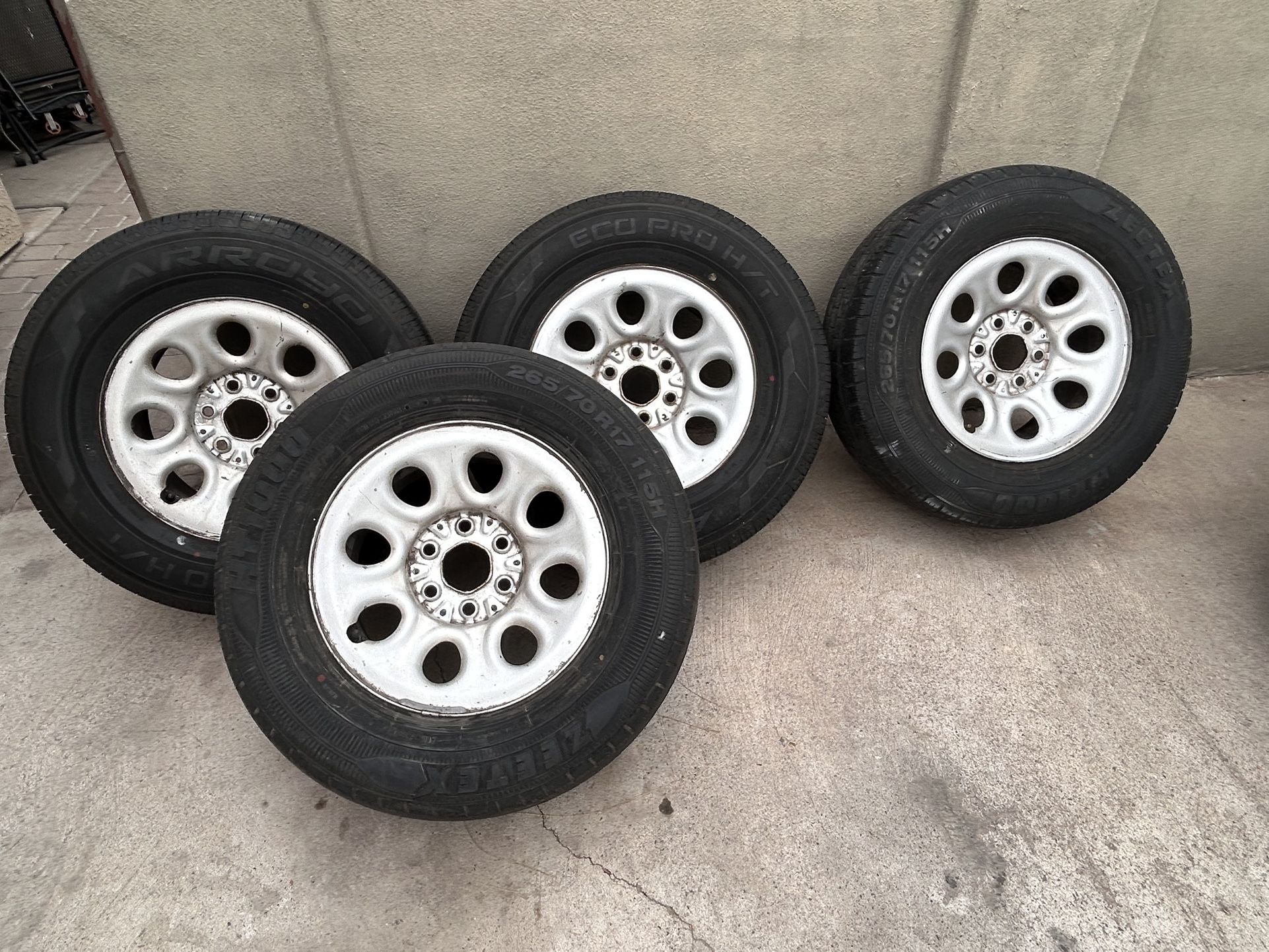 Spring heat is coming. Don’t gamble on worn tires. 4 truck tires on steel rims: • 2 nearly brand new (<1k miles) • 2 usable and hold air • Ready to mount today Fits 1999–2018 Silverado / Sierra 1500. The 2 new tires cost me $300 alone. Now selling the FULL SET for $300. That’s tires + rims. Serious buyers only. Low offers ignored. First with cash gets them. Spring season = work season. Don’t wait until a blowout costs you more.