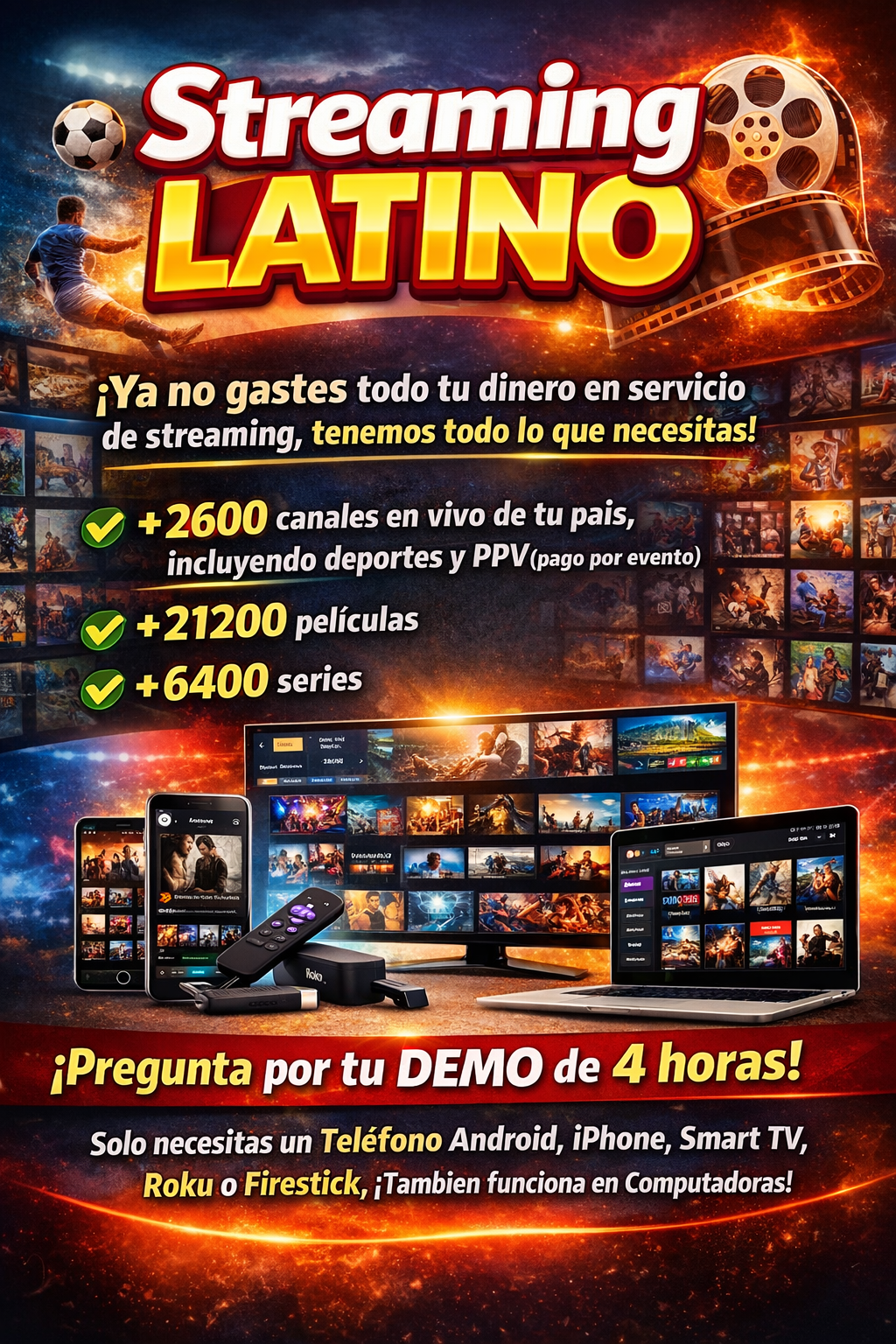 Ya viene con un mes gratis de Streaming Latino!! Disfruta programación internacional estés donde estes. Cuenta con: *+2600 canales en vivo( latinoamerica, usa y diferentes partes del mundo) * PPV (canales de pago por evento) *6400 series *+21200 peliculas * Contenido para adult@ Pide tu demo de 4 horas si es que ya cuentas con cualquiera de estos dispositivos!: ●Firestick •Android tv •Smart tv •Celular Android o Apple •Roku, rokutv •Pc