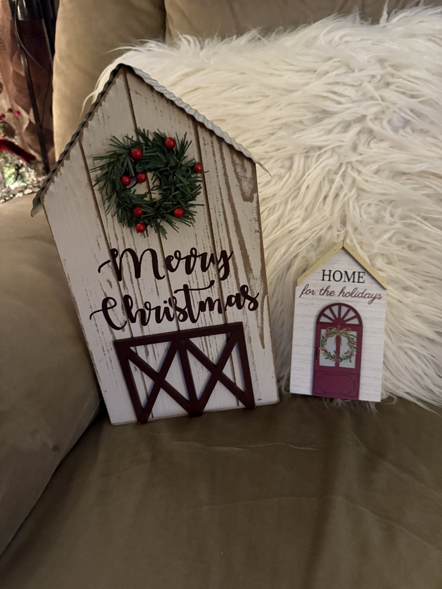 I am selling a new Christmas Wooden Barn and House. Barn is 6 3/4”L x 3 1/2”W x 12 1/2”H. The house is 3 1/2”L x 1”W x 6 1/2”H. Asking $20 cash. Firm.