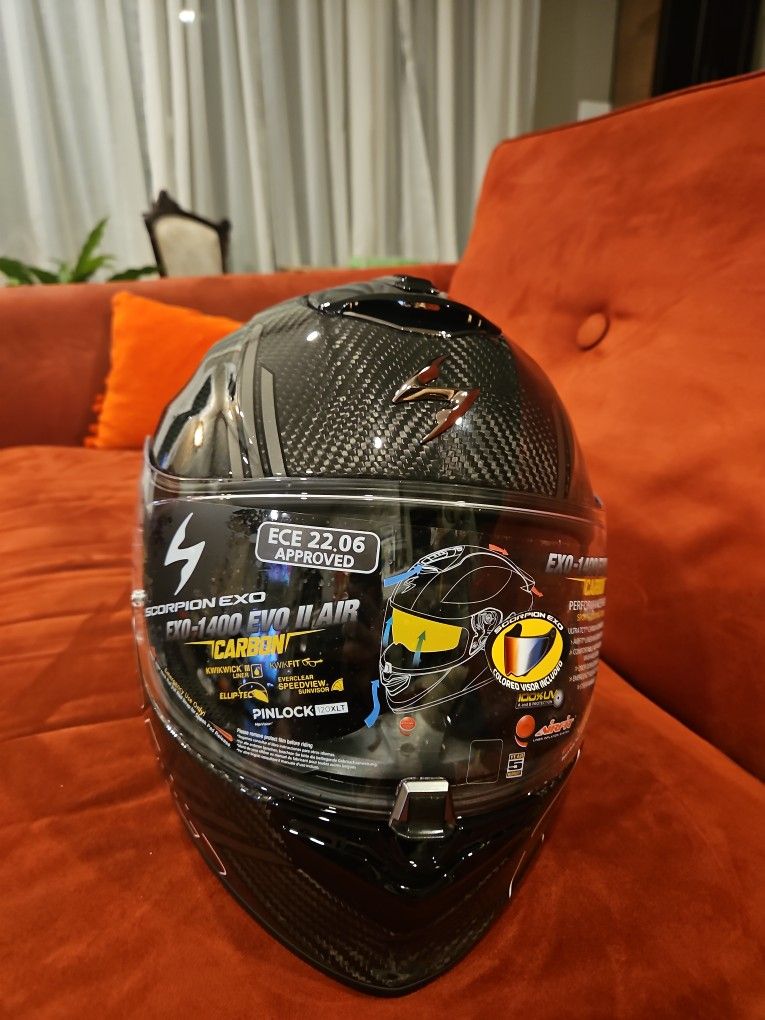 Scorpion EXO-1400 Evo 2 Carbon Air Reika Black-Silver-Blue (size M) Bought from Europe but it's too tight for me. This is a carbon motorcycle helmet, so very light, Never used (except to try it) still in box. comes with bag, pinlock and smoke visor.