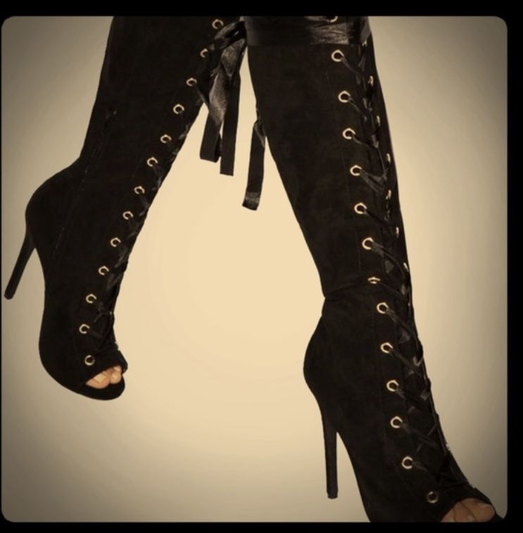 Sexy over-the-knee stiletto heeled boot with an open toe size 8.5 • Color: BLACK • Outside Heel Height: 4.75" • Closure: FUNCTIONAL SIDE ZIP • Shaft Height: 20.75"