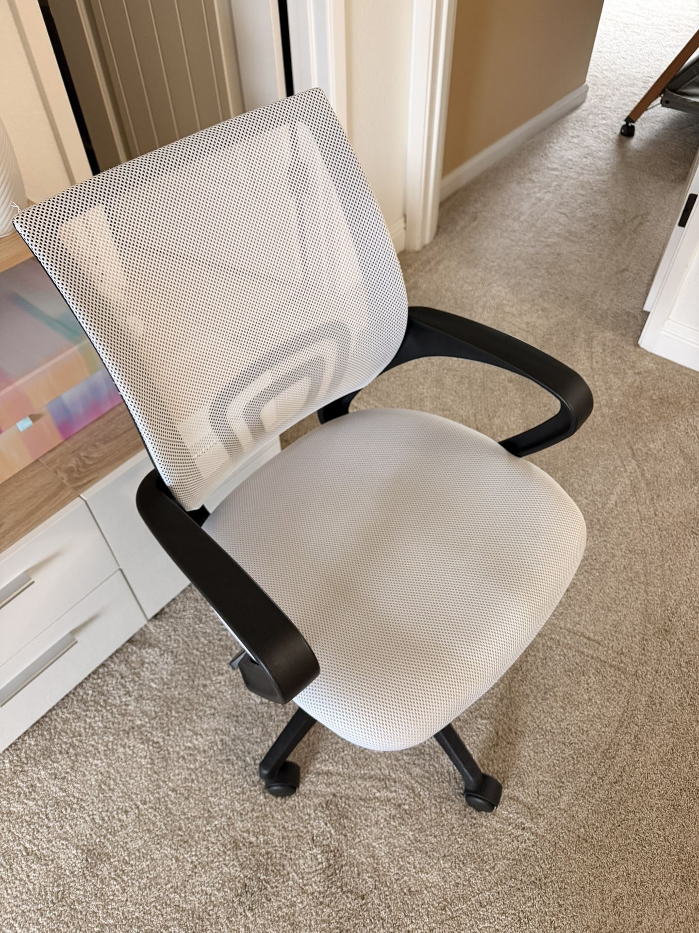 Free white office chair Rolls and has adjustable height Available for pick up only in Newark