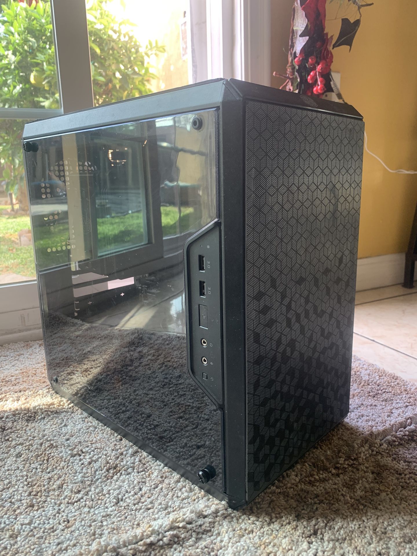 The case is by cooler master does have scuffs on front panel since it’s been sitting in my garage Also doesn’t come with a gpu and no type of storage but can be all added Comes with a Ryzen 5 2600 Cooler Master Hyper 212 16gb ddr4 ram 3200mhz Evga 600w BQ power supply Asus PRIME B450M-A Motherboard