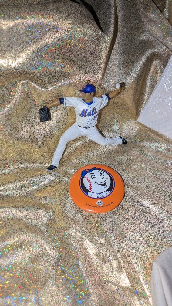 Mets memorabilia. ALL NEW. Never used or displayed. FOUR ITEMS! ⚾Santana #57 Hallmark ornament 4"high 5.5" leg span ⚾Mets pin 2.5" diameter ⚾LGM Vinyl bag new ! ⚾Mets playing cards "like new" ASK ANY QUESTIONS! Asking only $20 😊 Make me an offer ! 💙🧡💙🧡