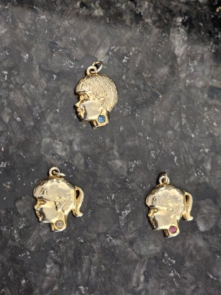 Boy charm is month of September Girl charm is month of February Girl charm is month of April Gold plated asking 40 for all 3