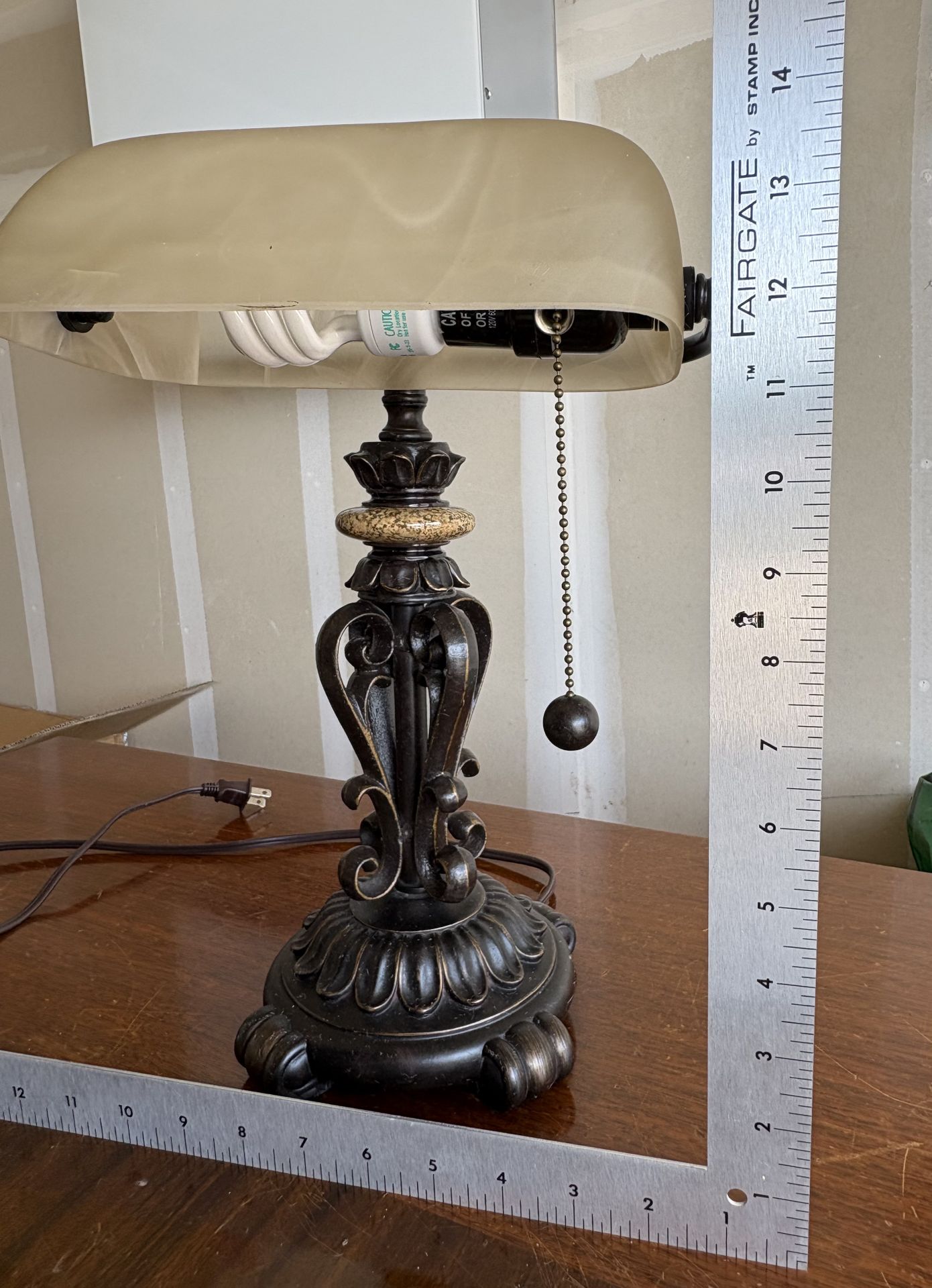 This is a bankers lamp with an ornate stand. There is slight wear on the lamp shade. Open to negotiations