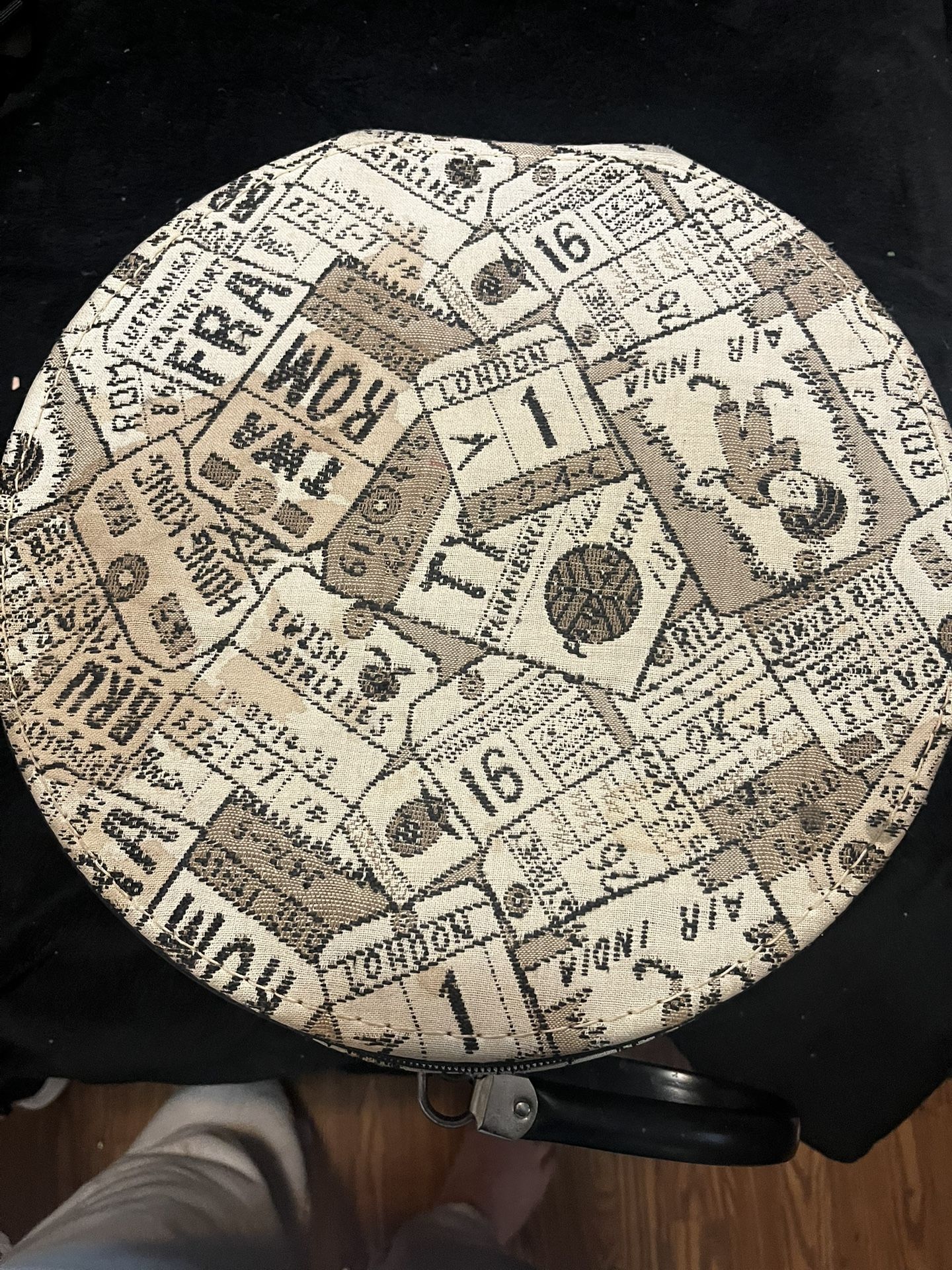 Vintage round carrying case tagged "Munro Zip-O-Niter" and dating to the 1950's. This suitcase was designed for use during short trips, mainly to hold personal items, undergarments and a change of clothing. This vintage overnight suitcase measures about 15" in diameter and is 6 1/2" deep.