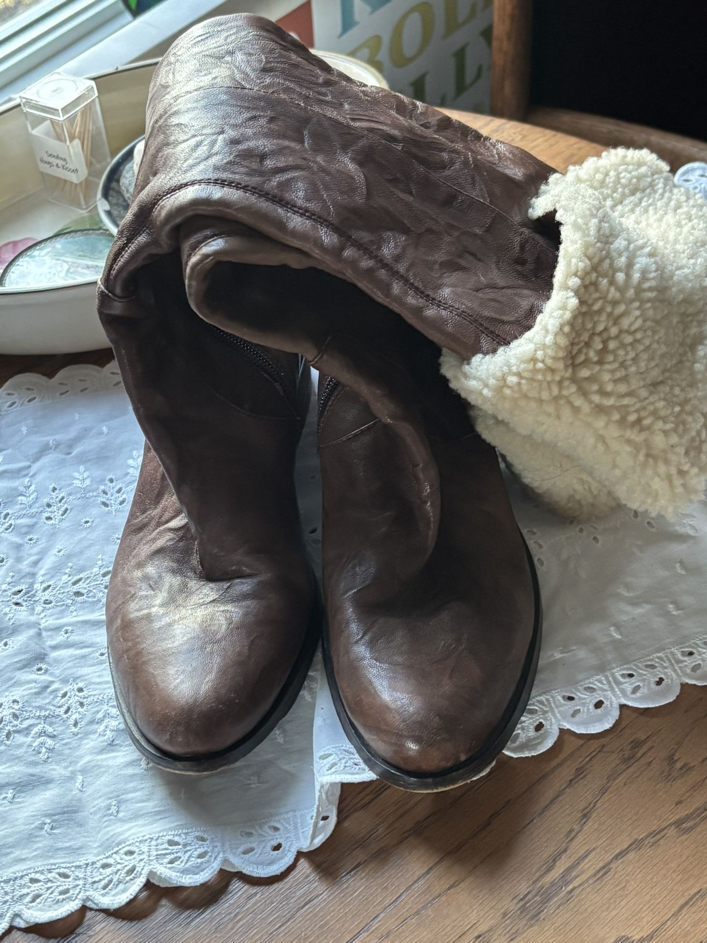 Brown leather fur lined