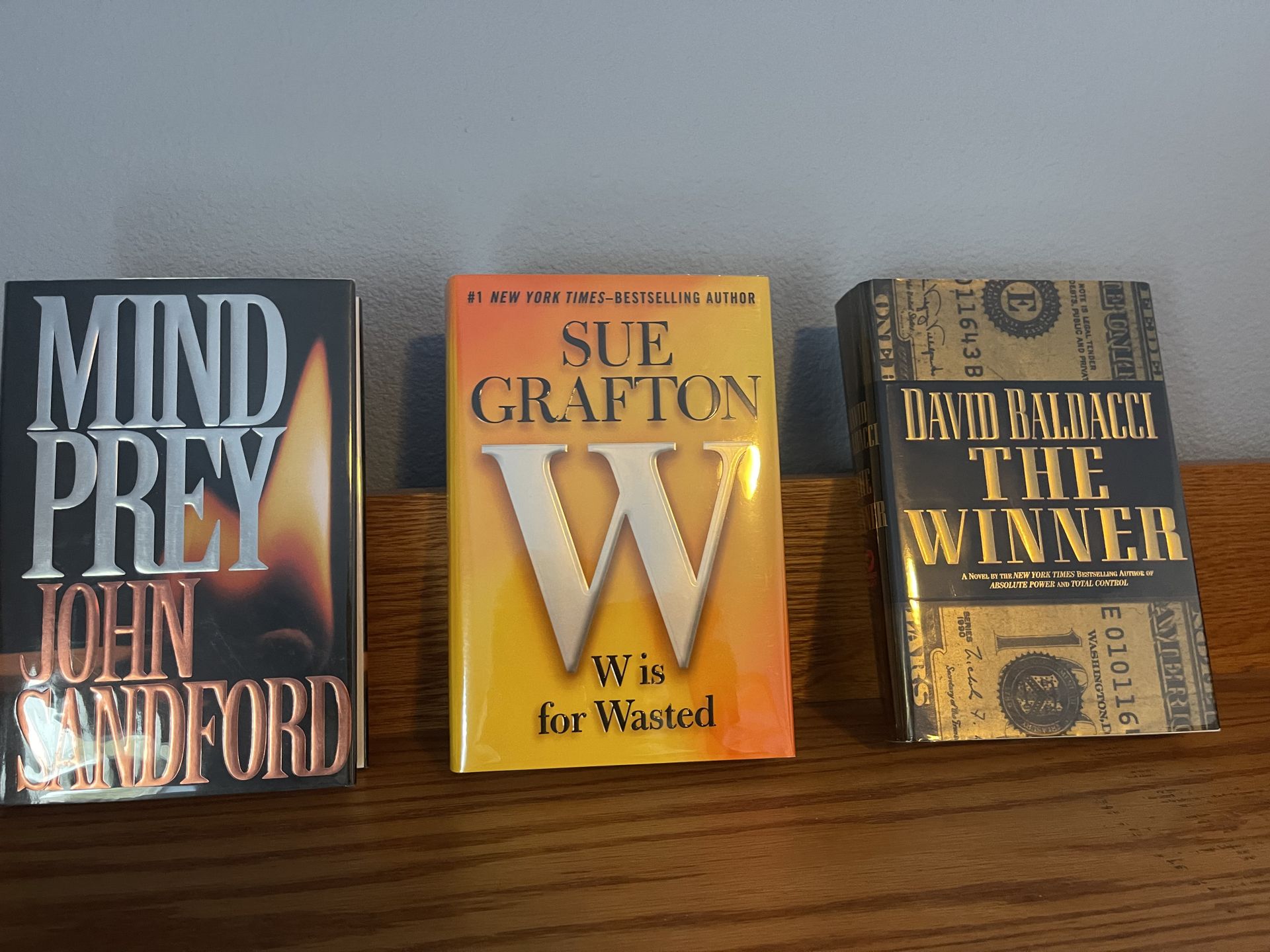 There are many books in this collection, all first edition, never been read and some signed by the author. Authors include Sue Grafton, John Sanford and David Baldacci. They are available for $2 each. Additionally there are many other hardback books by popular authors available for $1 each. All of these books are in pristine condition.