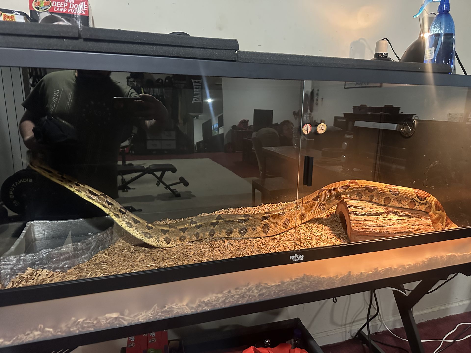 5 foot by 2 foot by 2 foot reptile tank, reptile habitats huge reptile enclosure comes with ceramic heat lamp and basking lamp with both fixtures. Message me for more info 6 foot long red tail bow fits comfortably in it and may or may not come with it message me