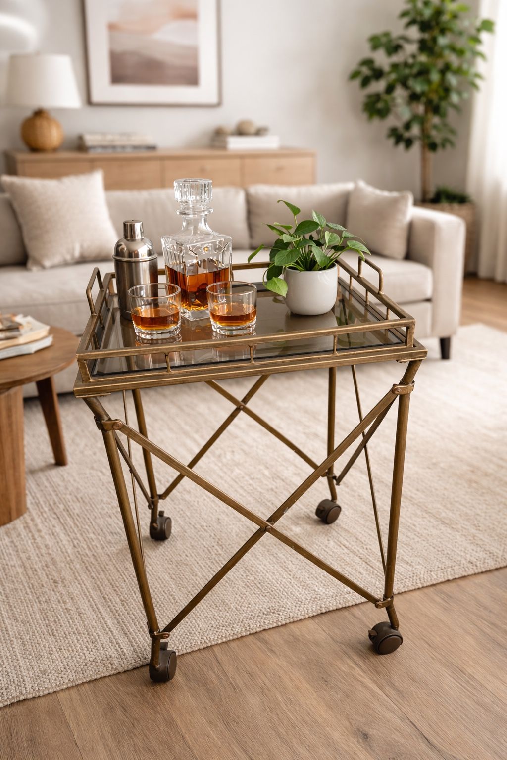 Vintage Brass Rolling Bar Cart with Removable Tray