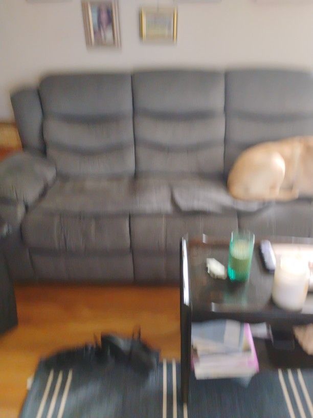 Blue sofa sides come up to put feet up good condition only 1 tear.