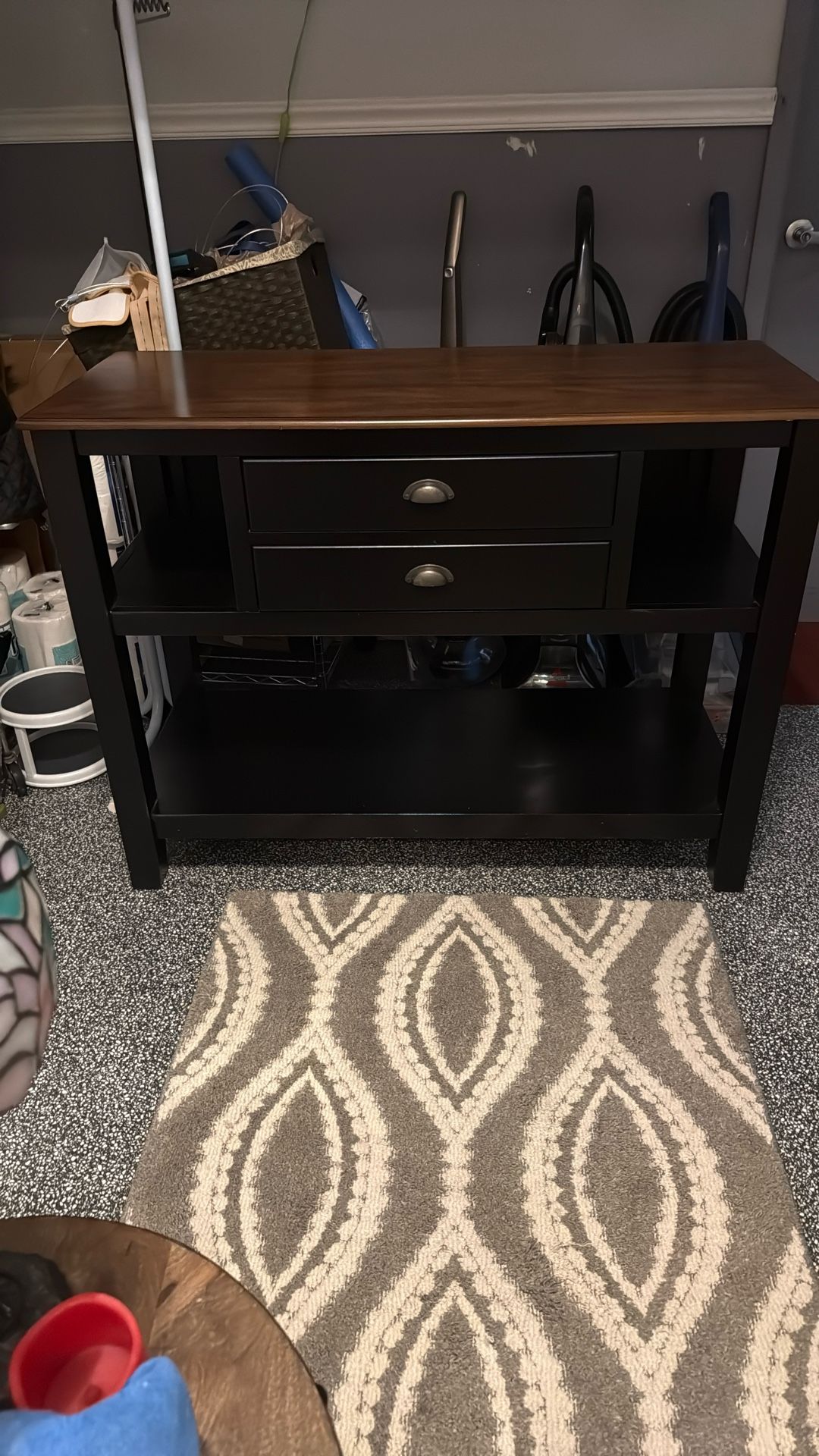 Good condition Measurement 4 feet long 3 feet tall and 20 inches wide From Ashley furniture Color is black with walnut wood top 2 full pull out drawers 3 shelves below. Serious inquires Only Don’t waste my time.