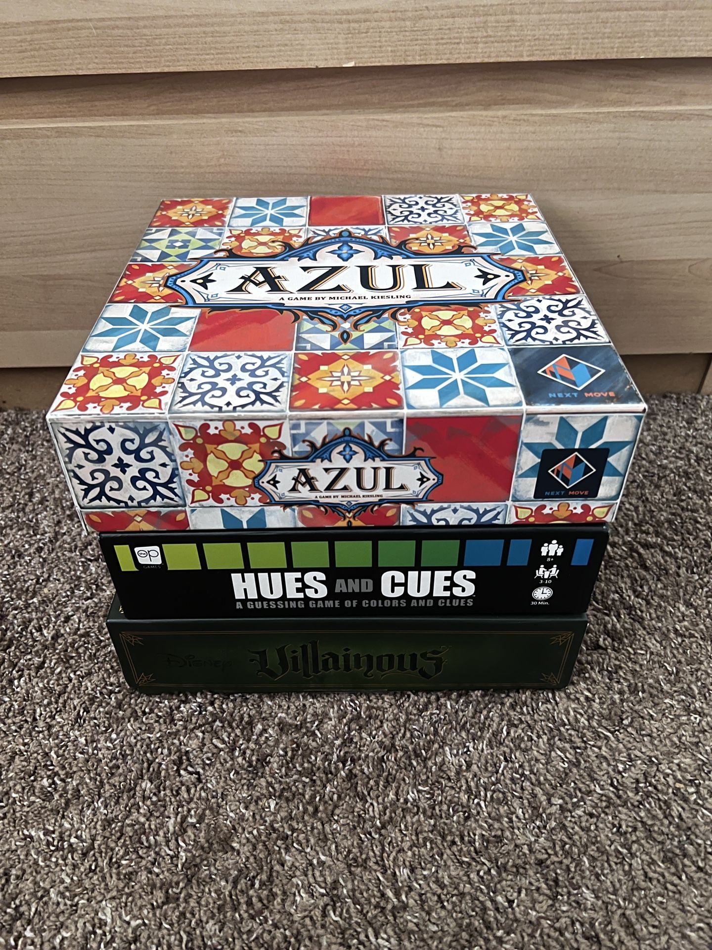 Selling board games I don’t play anymore. All 3 are lightly used and have all pieces. Azul (basically open box new) Hues and Cues Villainous Selling all 3 together for $60