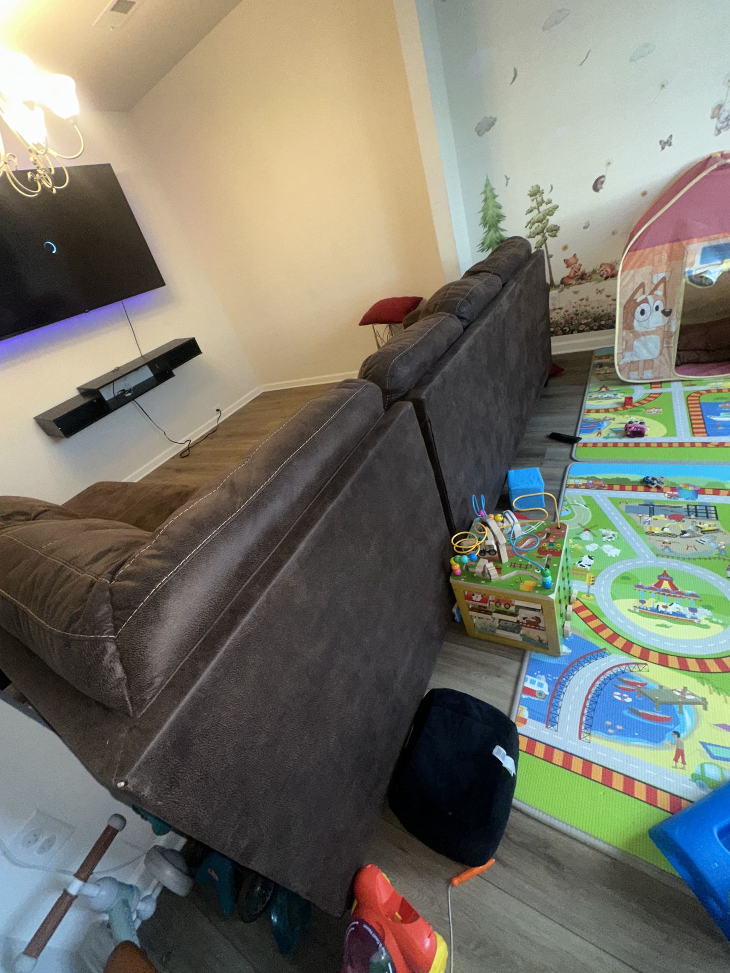 L safe sofa they do separate good condition selling house and all furniture. Has 2 burnt small holes from charcoal burn. But other that that it’s really nice. Cushing are good legs are great .