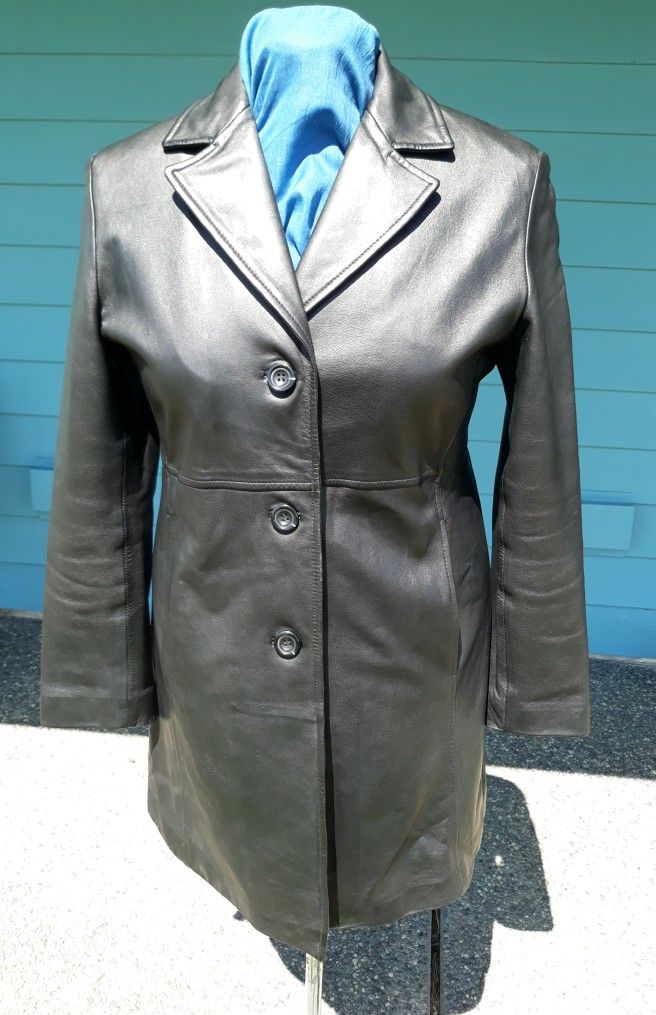 Like NEW - Soft and comfortable women's genuine leather trench coat. 3 buttons, notch color. 2 open hand pockets. Fully lined interior. Compares to Wilson Leather Trench. Black medium.