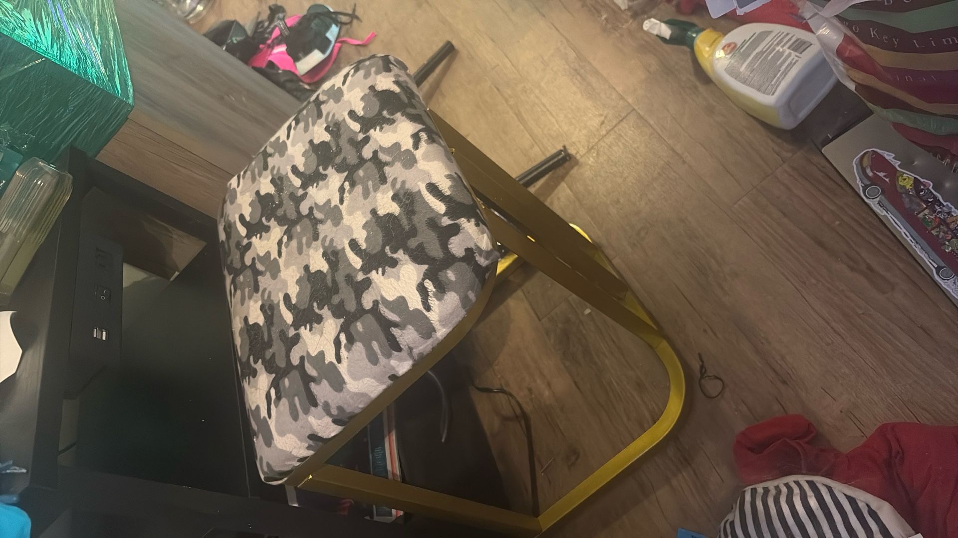Metal vanity chair. In good shape. Sturdy enough to hold 250 lbs plus person— although use caution when doing that because it gets creaky. Overall a good chair to sit and do make up or hair at. I lightly reupholstered the chair because I have pets. So the material underneath has never been exposed to pets. Obviously willing to pull the top layer off. Or you can. Just unscrew the chair and the fabric comes right off Dimensions: Height 17 inches Width: 15inches Depth: 12 inches Must pick up from 78741 zip code