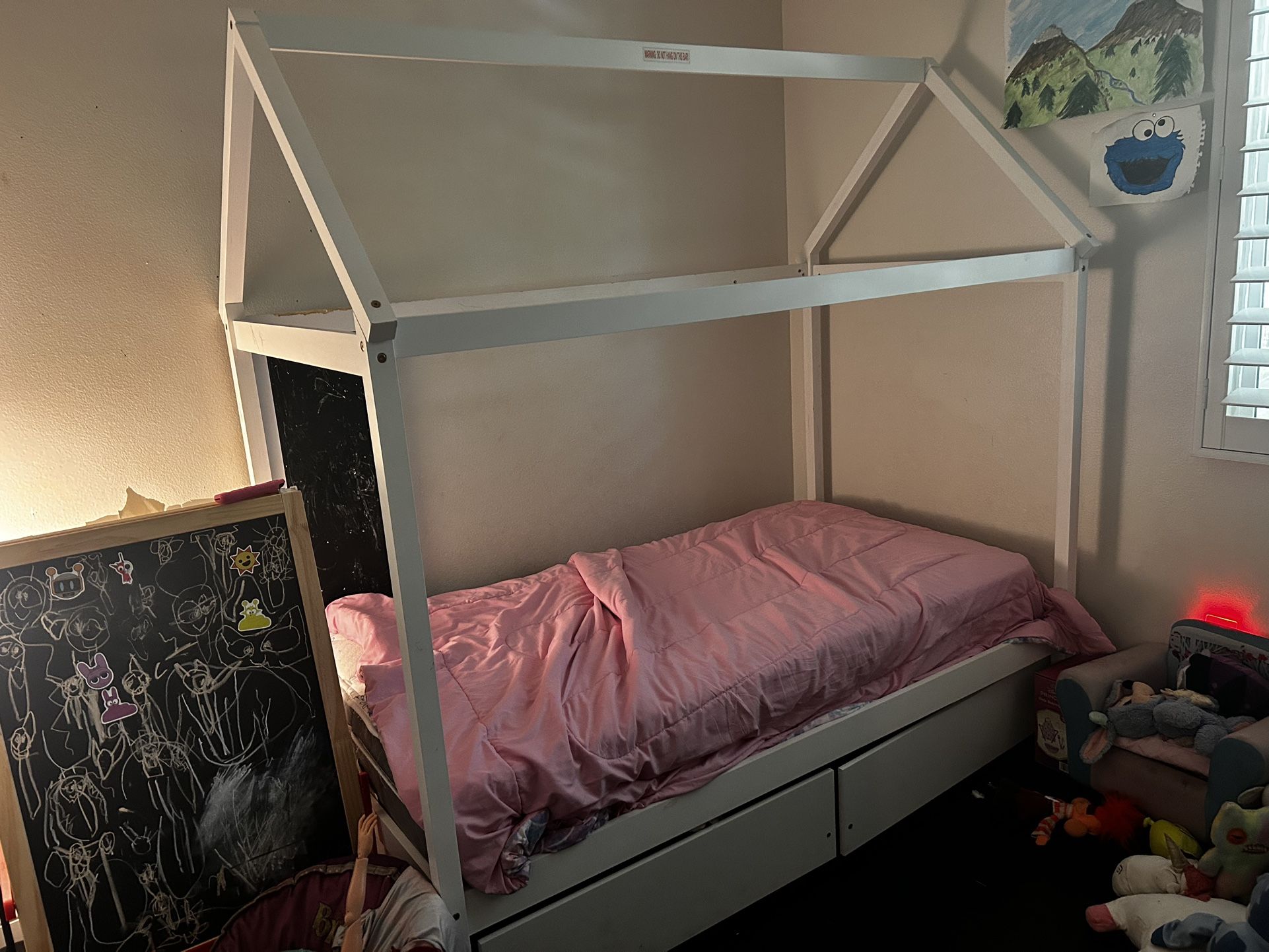 White twin size bed. House shape Normal wear for a kid Sliding storage drawers under bed