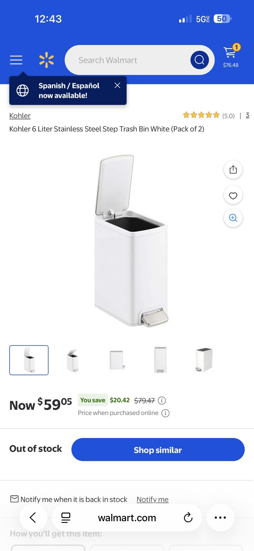 Kohler White Small Bathroom Trash Can 6L