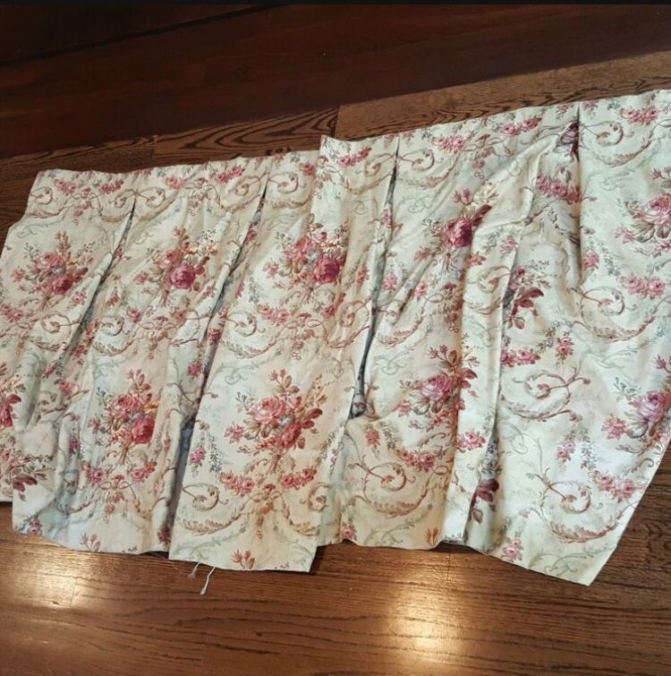 Custom balloon curtain, fully lined, hangs on a 2” rod, measures 66” wide, 32 1/2” long, strings to cinch up balloons, camel colored with light burgundy & green