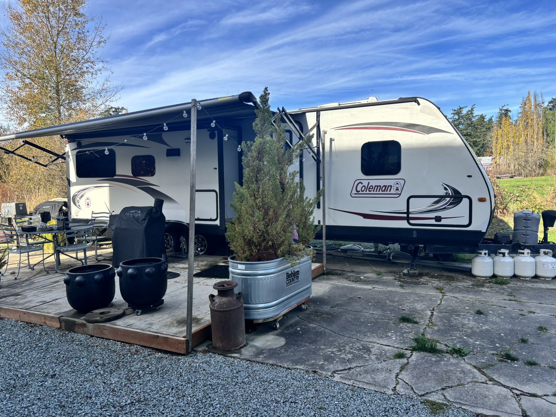 34 foot travel trailer. Large living area with a fireplace, recliners and loveseat. Winter package.