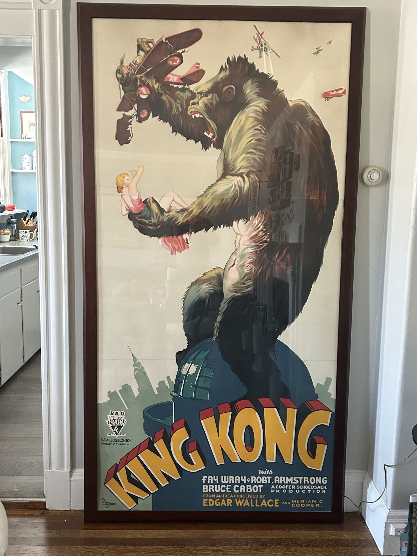 Excellent Condition! King Kong movie poster. Poster is in a wood frame with a plexiglass covering. Overall size: 45”wide x 86” tall.