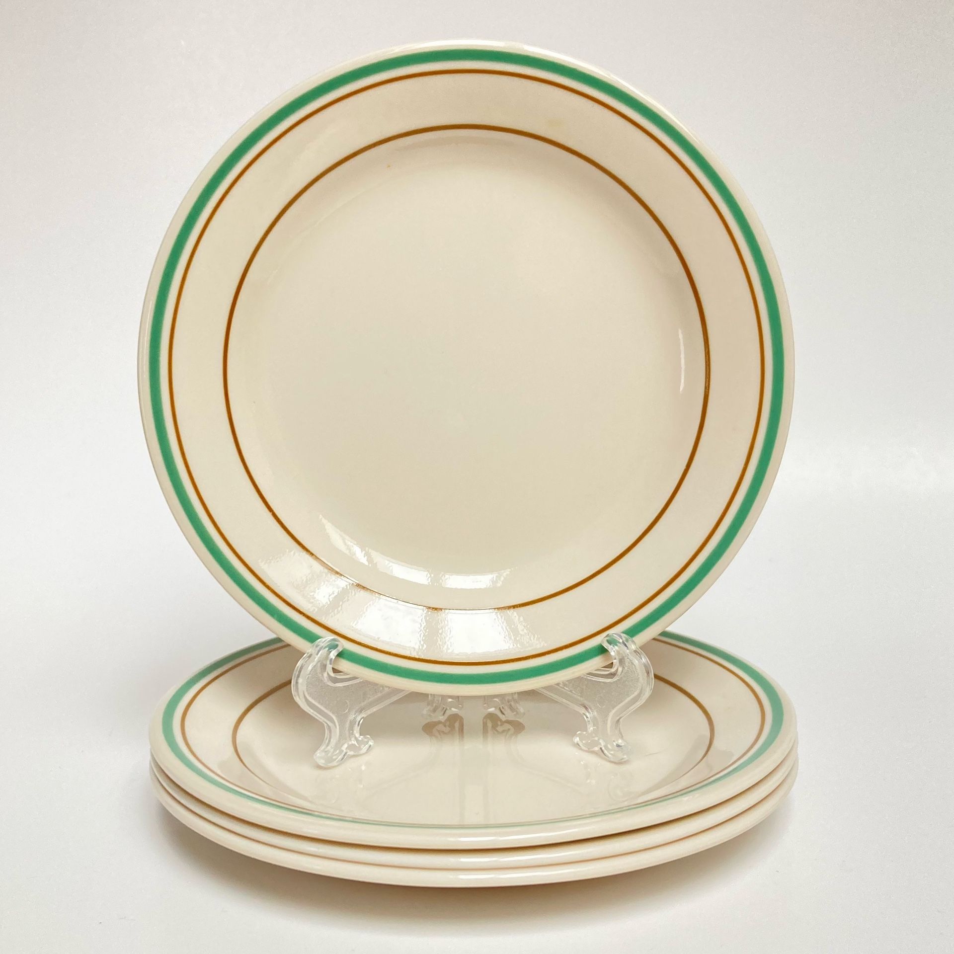 Set of (4) Vintage Corning CORLAR Comcor Bread/Salad Plates Cream, with green band and two brown rings. Nice condition! A few flatware scratches to the wells, and mild cloudy stacking wear to bottoms. Diameter: 6.25”