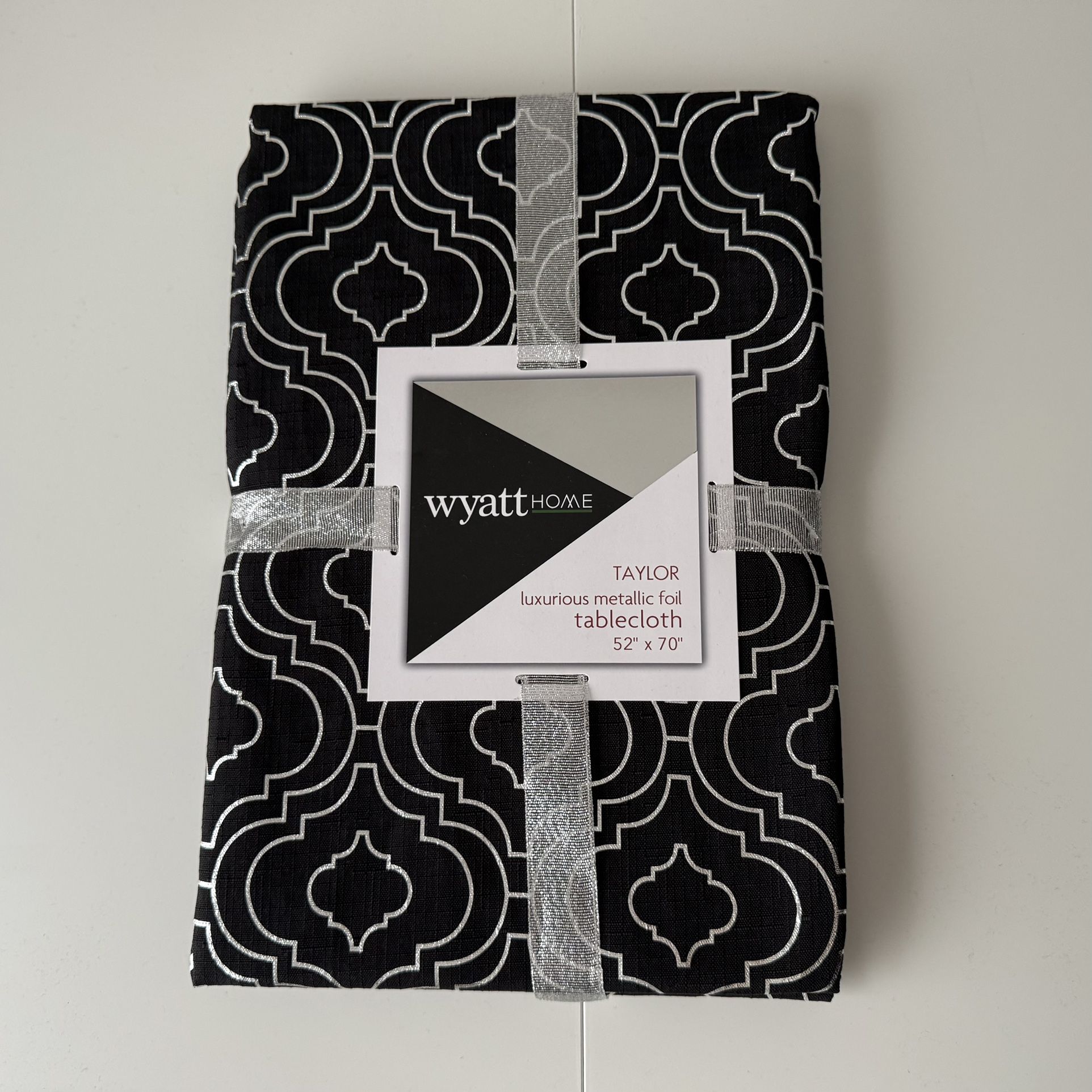 Brand new, never used. Still in original packaging. Black with silver metallic design – very elegant! Perfect for Christmas table Decor or everyday use Size: 52 x 70 inches (132 x 178 cm) Fits tables that seat 4 to 6 people.