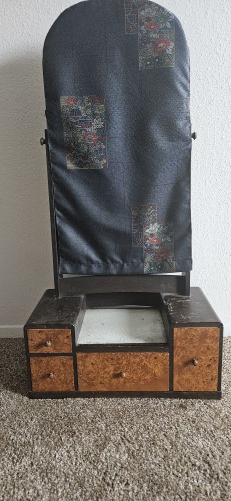 1930s japanese kyodai floor vanity, mirror in perfect shape, just slight spots on the very edges, inspired by waterfall furniture of the time