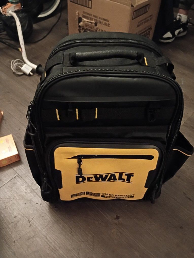 DeWalt pro backpack DWST560102 Comes with 2 large pockets and 3 small pockets. Back large pocket has a laptop sleeve and front pocket has tool storage. Bottom small pockets are water proof. Also has 2 side pockets for water bottles. IP54 water and dust proof.