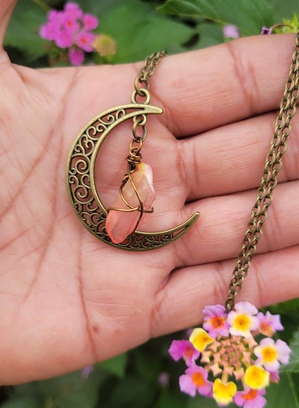 Sunset Aura Quartz Crescent Moon Necklace, crescent moon measures 1 1/2 inches, Antique Brass, pendant placed in a 24 inch brass chain, pictured necklace is the one you will receive. 25% off if purchased through my Etsy Shop Crystal Vibes by Thelma