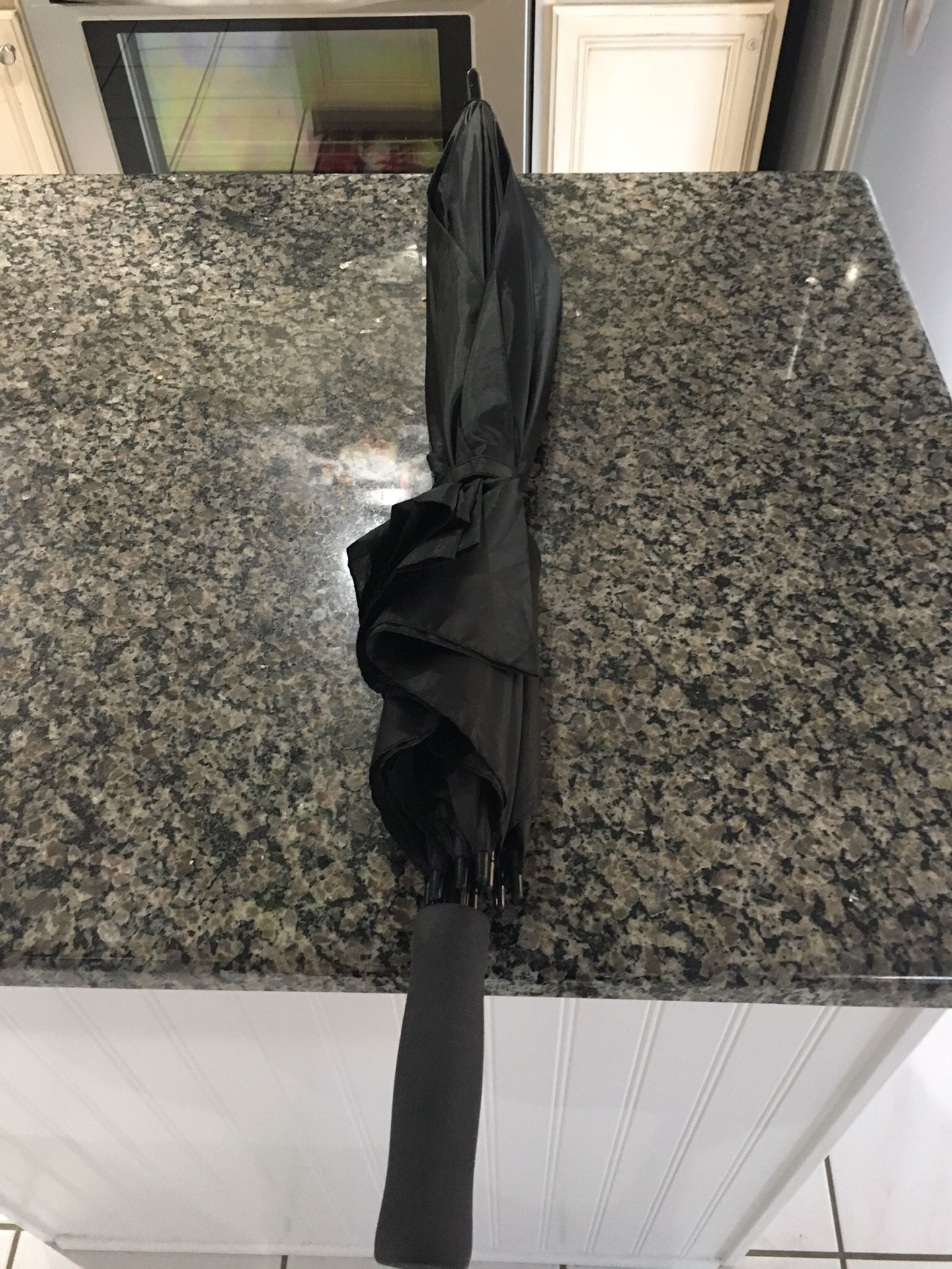 39.5” Classic Black Umbrella. Large covering. Does not collapse to make shorter. Condition is Pre-owned, excellent, small rust stain at some braces, tiny hole not noticeable.
