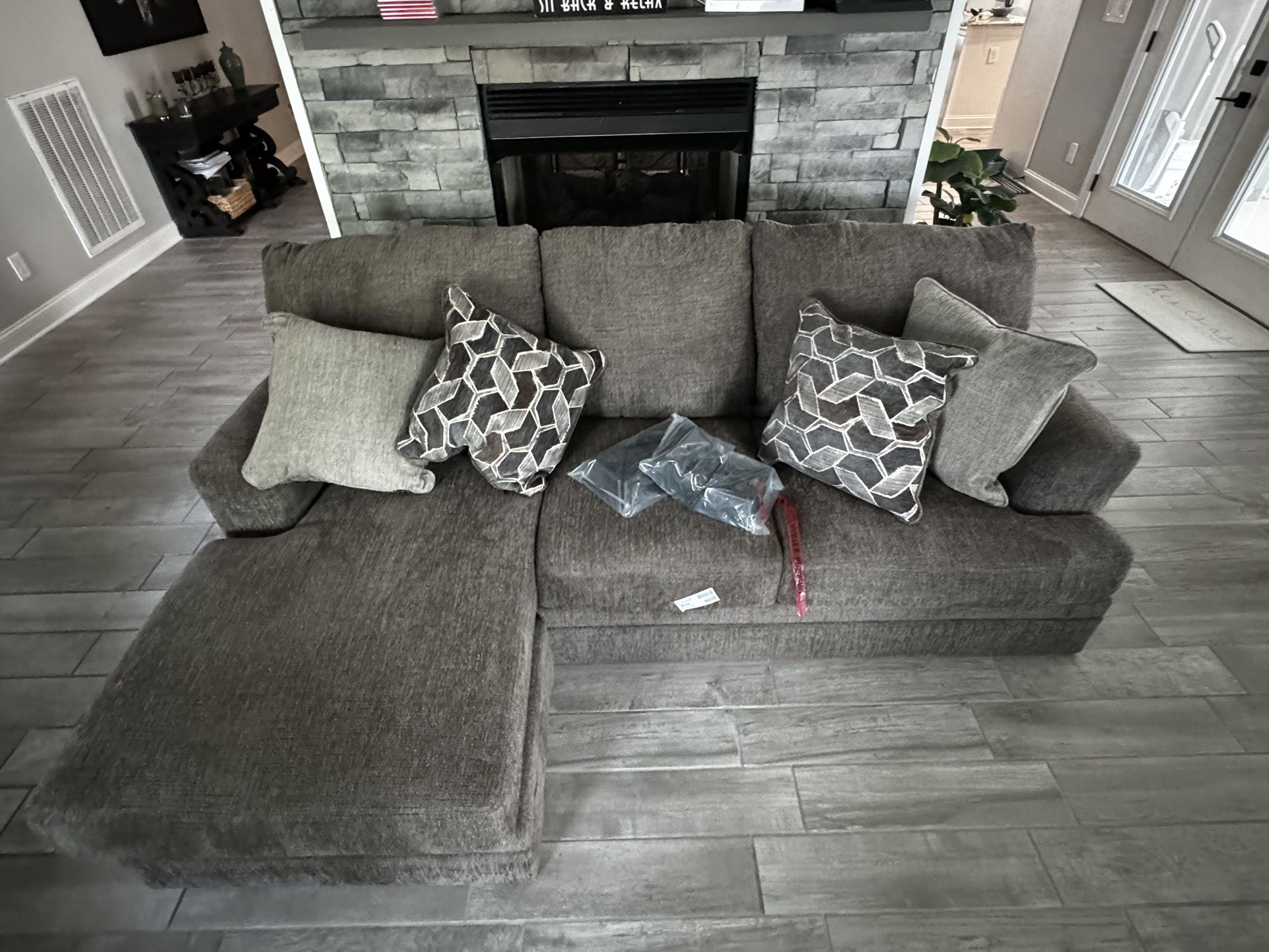 Brand new! 91 inches wide. Brownish gray sofa Comes with 4 original pillows. Comes with stands ( In bag yet to be opened )