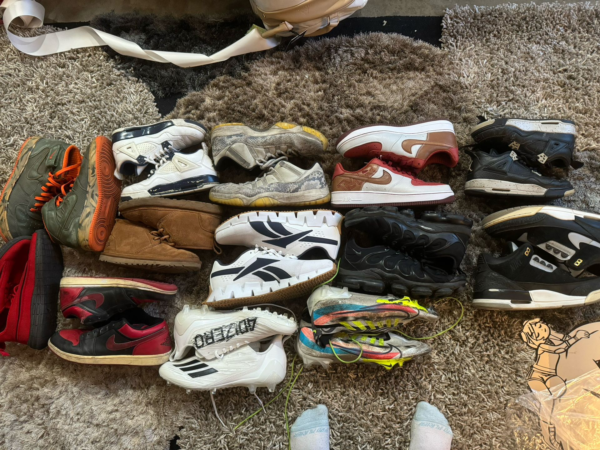 White adidas cleats are brand new $100 size 12, reeboks size 12 $30 missing a shoe sole, 4s are size 5 y, majority are size 12, some 11, & size 10 1/2. Shoot me an offer or take everything for $300. We’re leaving the state so we’re getting rid of everything.