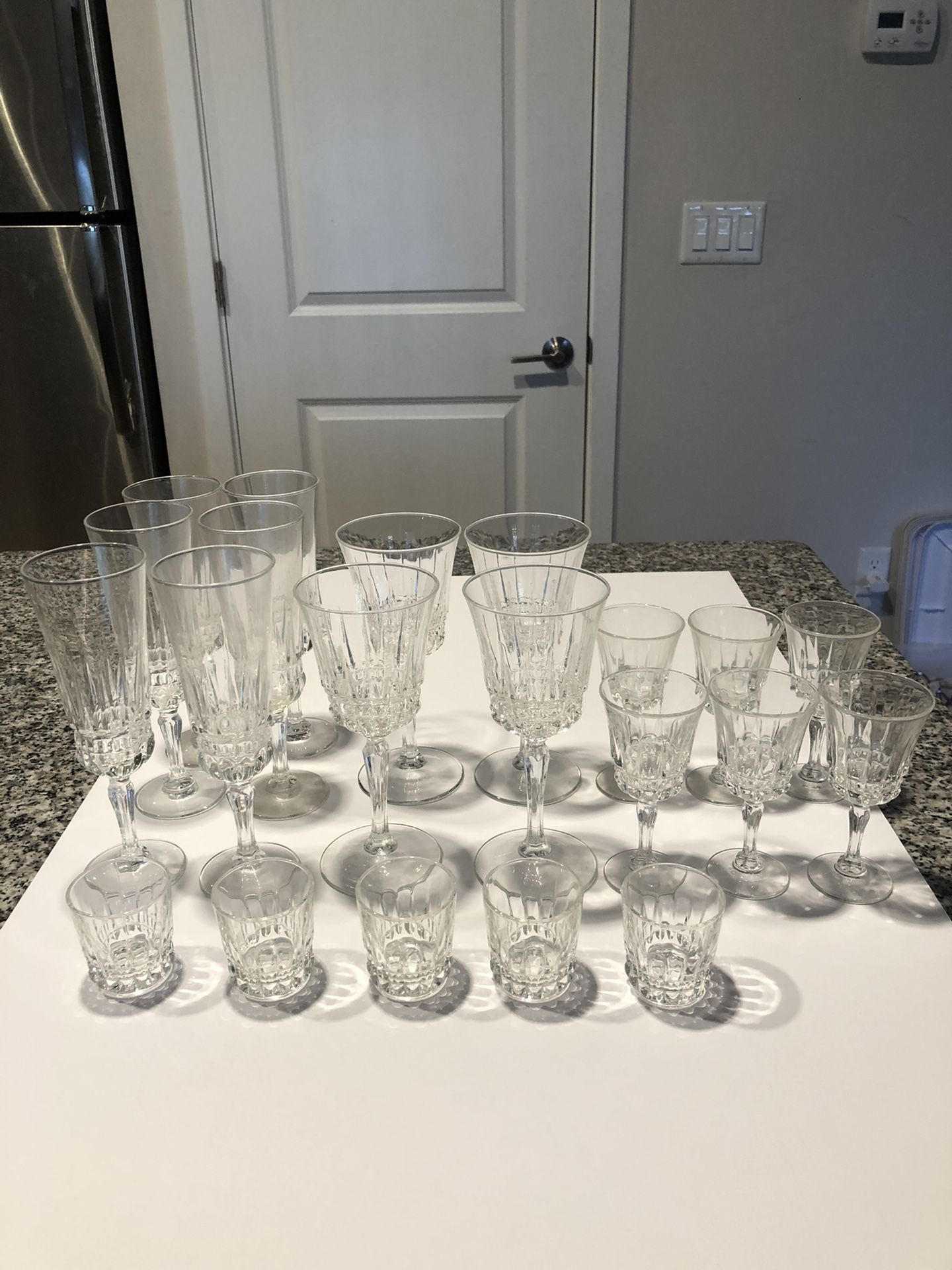 Champagne flutes, wine, shots, whiskey glasses