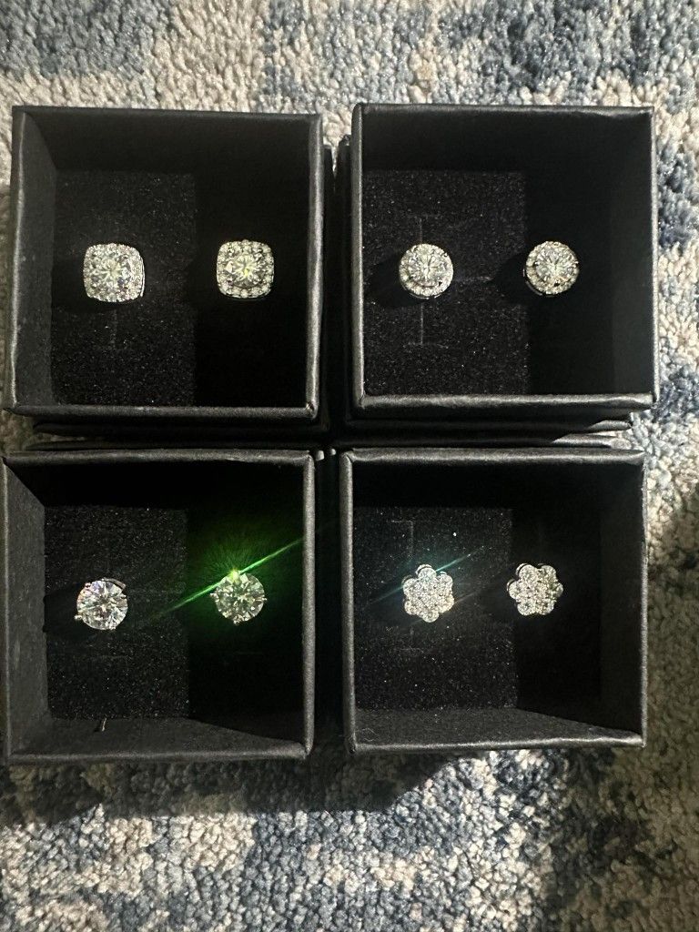 BRAND NEW VVSI Moissanite Earrings! <Pass Diamond Tester> *Comes with box, Certification Papers, & Certification card! *Screw back *The earring metal is 925 silver (sterling silver) *VVSI *The price is for the smaller sizes... these come in an assortment of sizes *Will pass diamond tester! (I will bring a diamond tester with to show you) - i also have diamond testers for purchase as well *Comes in nice Box, Extra $5 for a Velvet box *FREE polishing cloth *You have to remind me at pickup PICKUP ONLY *All meet-ups done at the police station (dont message me if youre not willing to come! ) *ANY QUESTIONS PLEASE FEEL FREE TO ASK side note: I have a lot of other earrings available. I am a real jeweler, and I have a website that you can check out and see what else I have available. (If you see something you like on there you can also inqure on this posting). You can also directly reach me via phone What Are Moissanites? Moissanites are lab-created gemstones renowned for their brilliance, fire, and durability, often used as diamond alternatives. They offer similar sparkle to diamonds but at a fraction of the cost. While diamonds are natural gemstones formed within the Earth, moissanites are synthesized in controlled laboratory environments. Both have unique qualities
