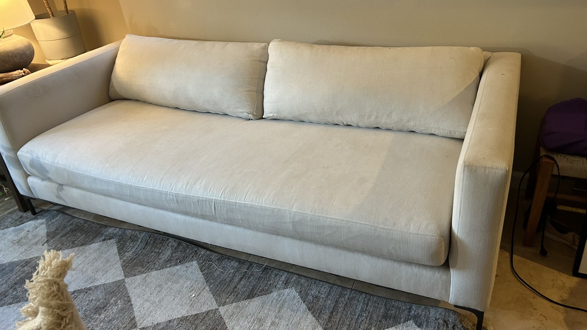 Removable zippered covers for all cushions back and seat. No smells whatsoever but does need light cleaning. I need it gone today. Dimensions are in the pictures.