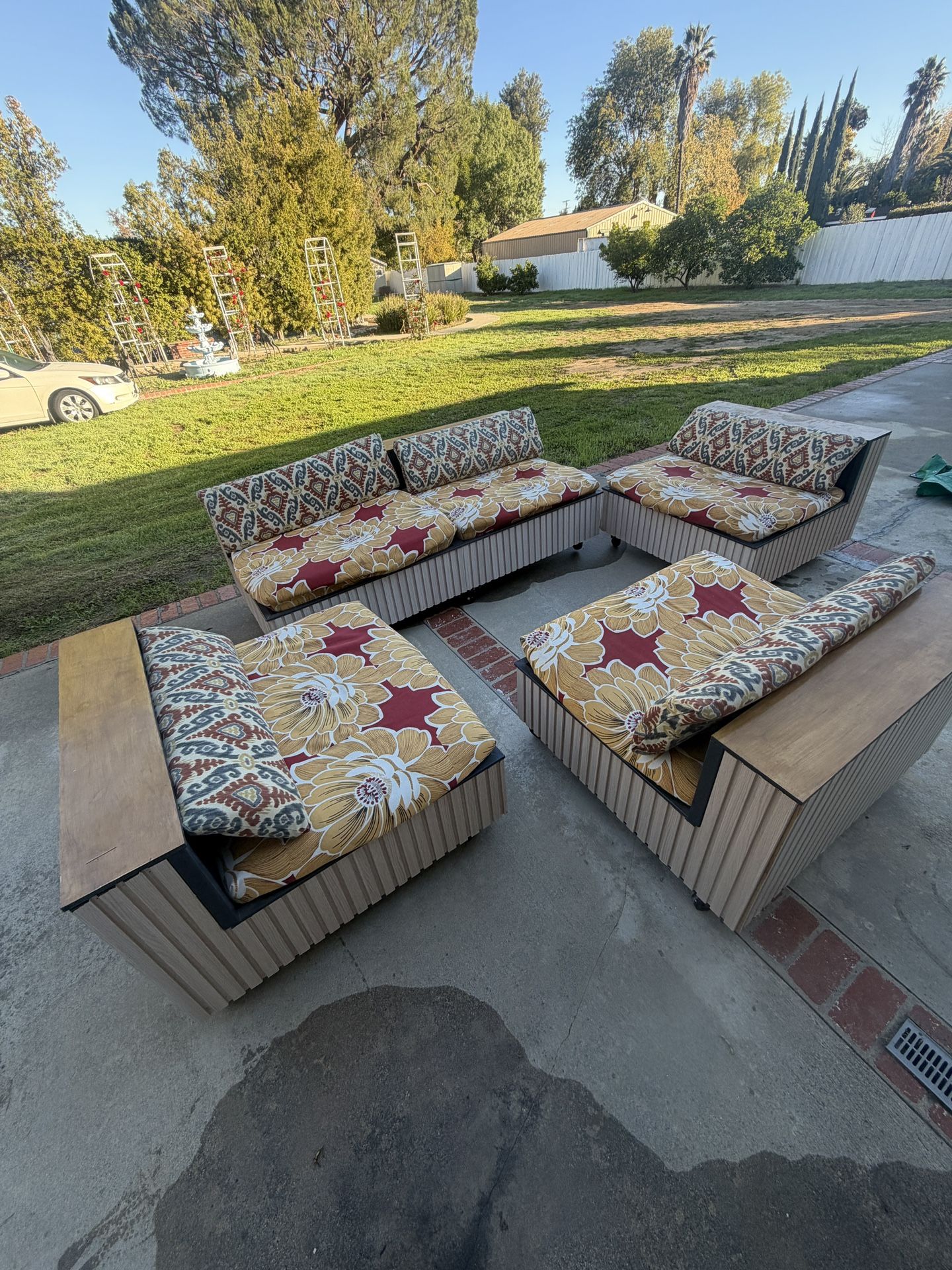 • Modular outdoor seating set • 4 total pieces: – Three freestanding square seats (two shown configured as a loveseat) – One double-seat sofa • All seat cushions and back pillows included • Sunbrella outdoor fabric on seat cushions (removable and washable) • Back pillow fabric is not removable • Each piece has 4 solid caster wheels (2 locking, 2 non-locking) • Heavy-duty, solid construction • Rolls easily but is heavy 📏 Please see photos for dimensions 🚫 TABLE NOT INCLUDED Pickup only — no delivery Buyer must bring own transportation Will require 2–3 people to load into a truck or trailer