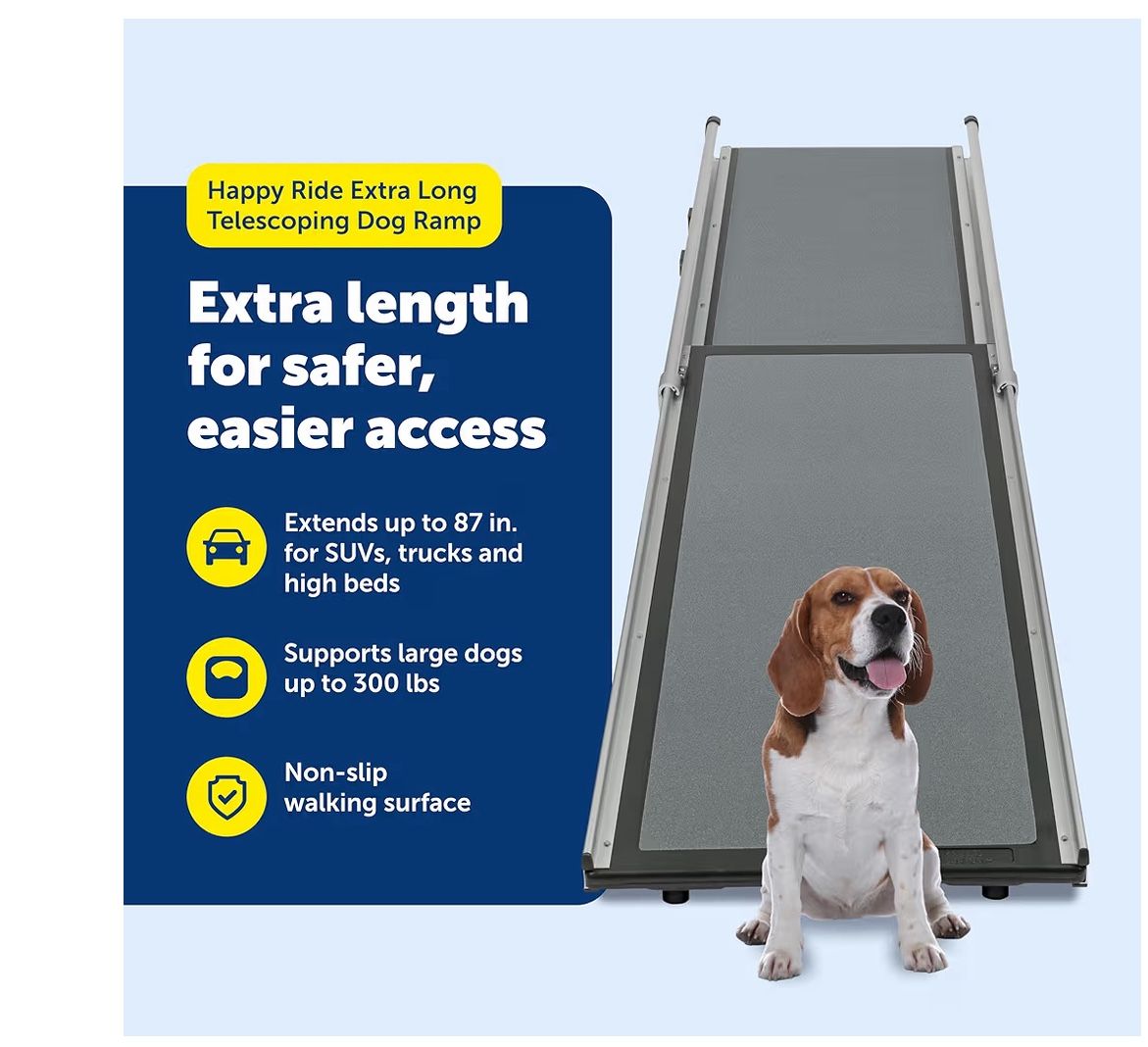 Telescoping dog ramp with non-slip surface, extends up to a certain length for easy access into vehicles or over steps, supports large dogs, some scratches on the surface. 7’ fully opened. Closed is 4’. Portable