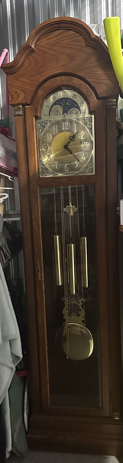 Beautiful Ridgeway grandfather clock. Has a moon phase dial, chimes, and a visible pendulum with weights. Clock was serviced yearly. Last year its been storage. Selling because I'm moving.