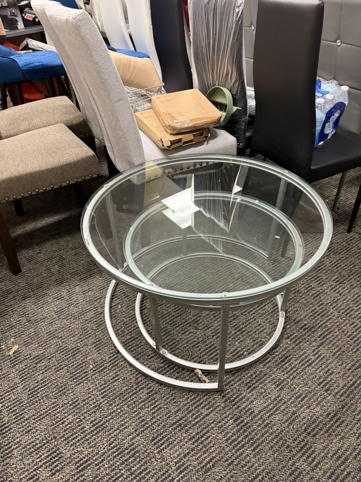COFFEE TABLE 2 SET, SILVER LEGS, TEMPERED CLEAR GLASS TOP 8mm TEMPERED GLASS 17” H x 31.5” D 15” H x 23.5” D
