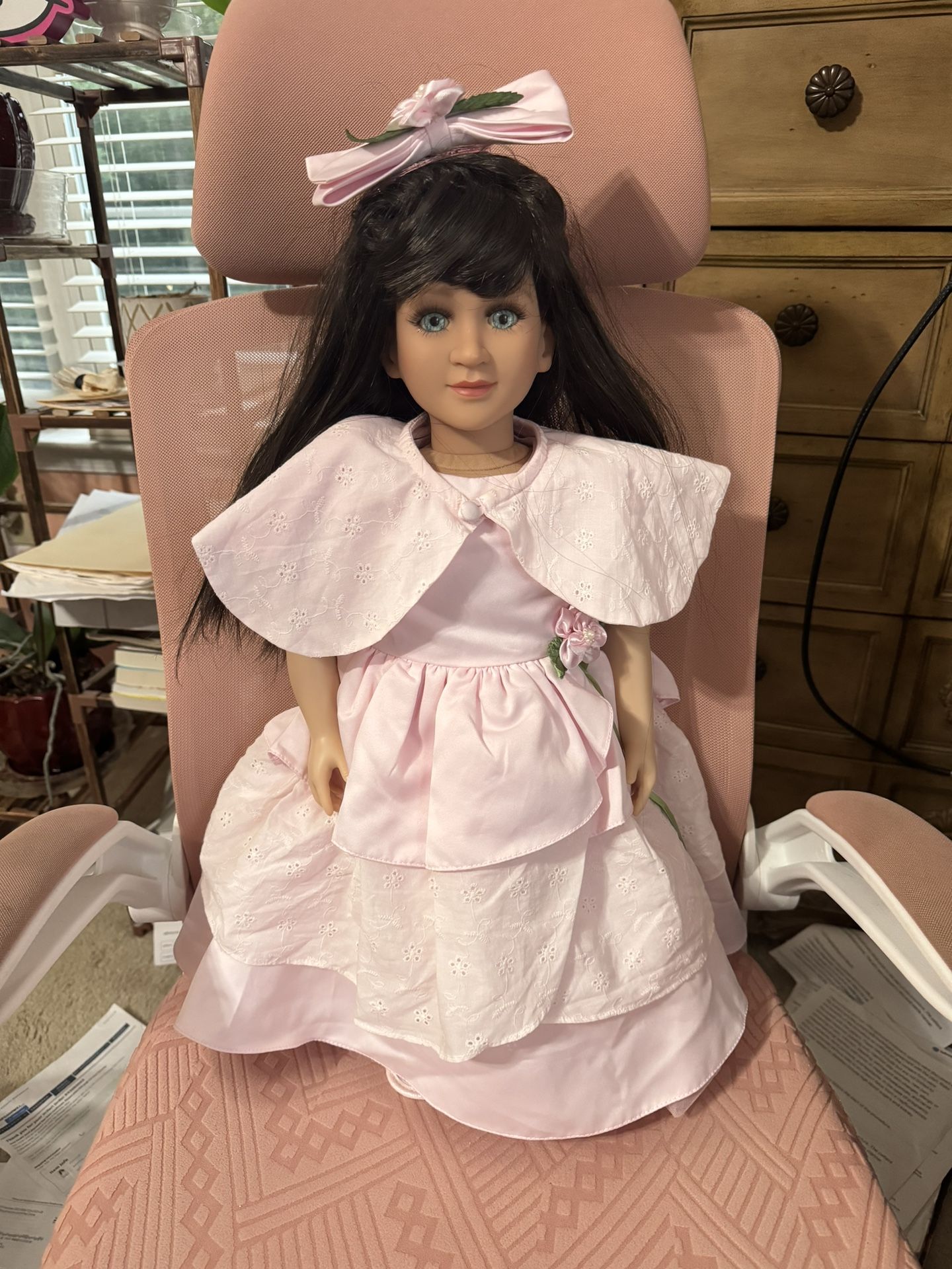 My Twinn doll approximately 23” tall . She has soft body and vinyl limbs . Her soft body has some pull threads behind her right leg see picture . ( very few) Her head is little wobbly , other than that she is okay .,Gorgeous Dark brown hair , light blue eyes. She is wearing a beautiful light Pink “ My Twinn brand long dress and hair piece . Her sandals are Baby sandals size 0-3.