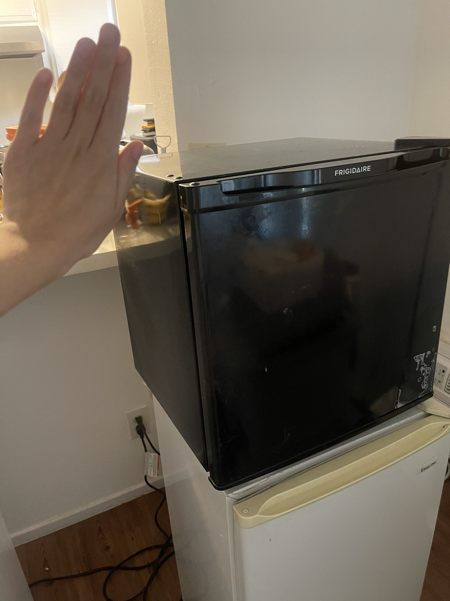 Small black fridge Has a space for soda cans Lightly used and just cleaned The freezer works too