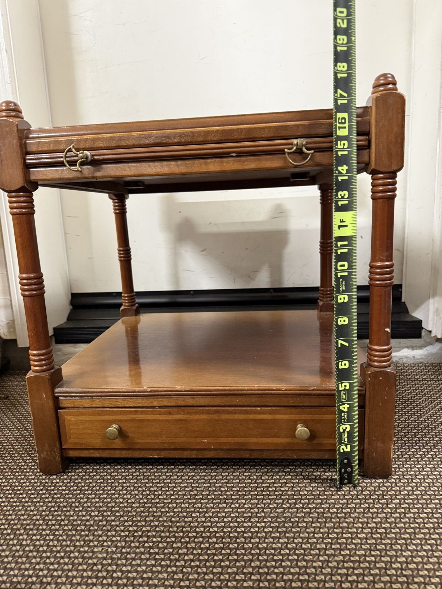 Small end table with pull-out shelf and bottom drawer. Good condition. Measurements in picture.