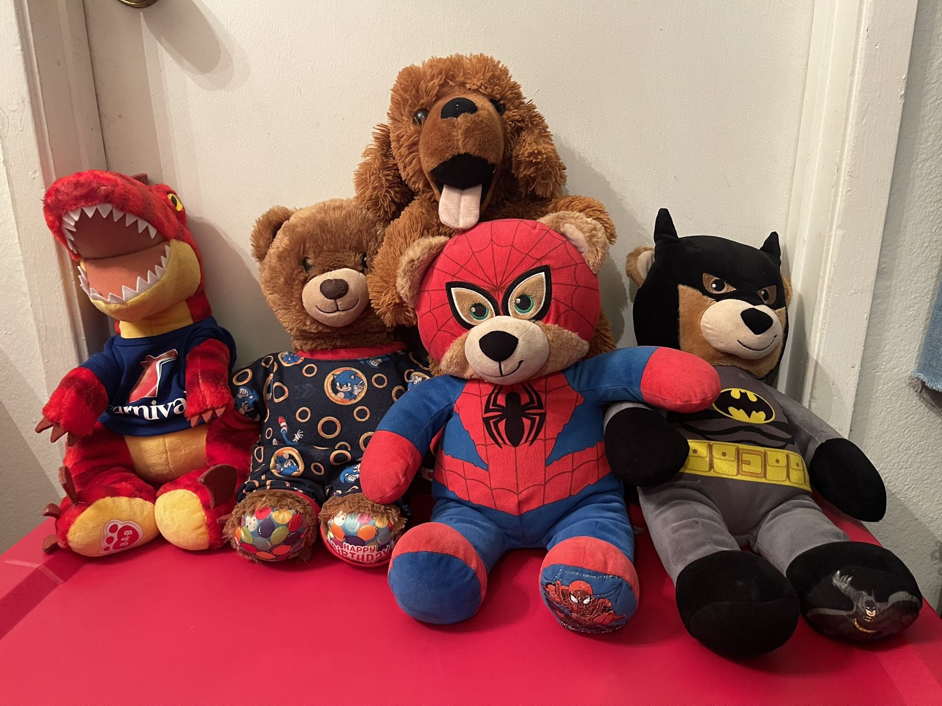Marvel and DC bears 12$ each or 2 for 20$ Dino 8$ Birthday bear 5$ Stuffed puppy 3$