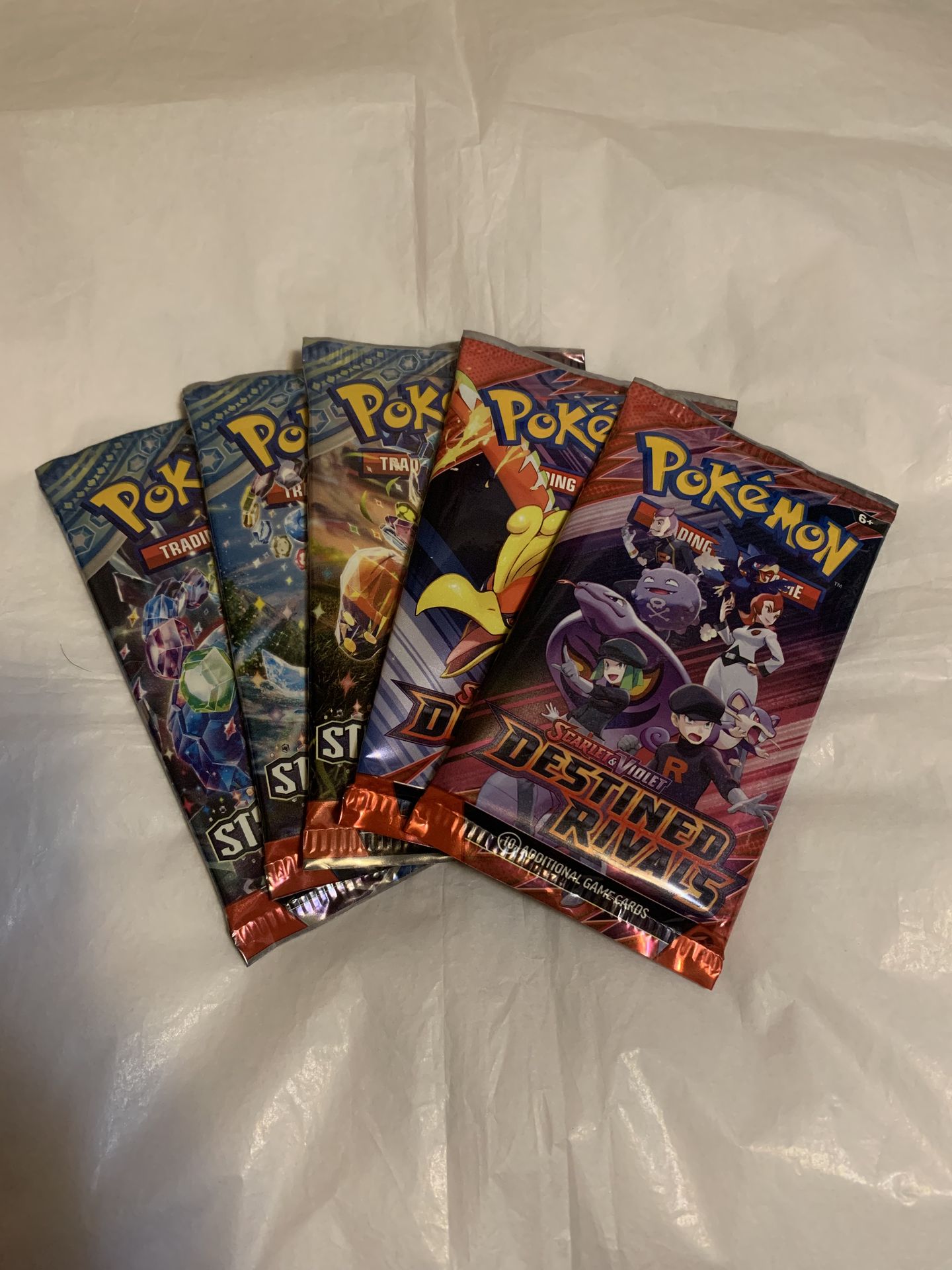 Pokémon TCG. Lot of 5 Pokémon Booster packs. Includes 2-Destined Rivals and 3-Stellar Crown Booster Packs. Brand new!! Factory sealed!!