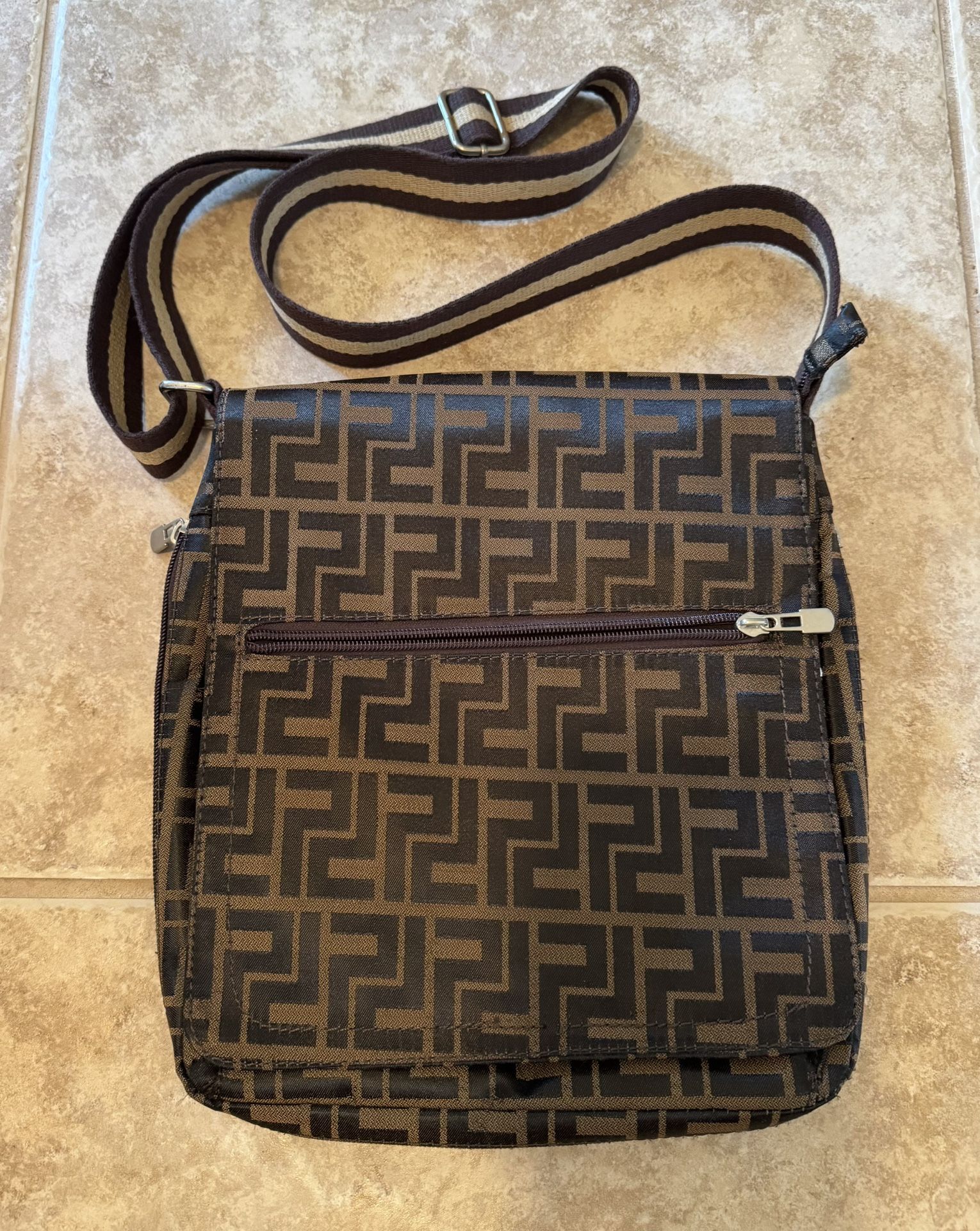 This awesome black and brown shoulder bag is super cool and is in excellent condition. In addition to the main compartment, it’s got 5 zippered pockets: 1 on the outside front flap 1 on the back side 2 behind the front flap on the outside of the main compartment 1 small pocket in the lining of the main compartment There is also a non-zippered smaller pocket in the lining of the main compartment. A zipper that runs along the entire outer bag that can be unzipped for a little bit of extra room. The flap has a magnetic snap. The strap is adjustable. It has a unisex feel, usable by anyone looking for a bag with style. Dimensions: 11” height x 10” length, without straps Cash only . Available almost anytime on weekends and only after 5 on weekdays. Public meetup is in S. Fort Myers at Walgreens on the NE corner of US 41 & College Parkway. Address is 12749 S. Cleveland Ave. Fort Myers 33907.