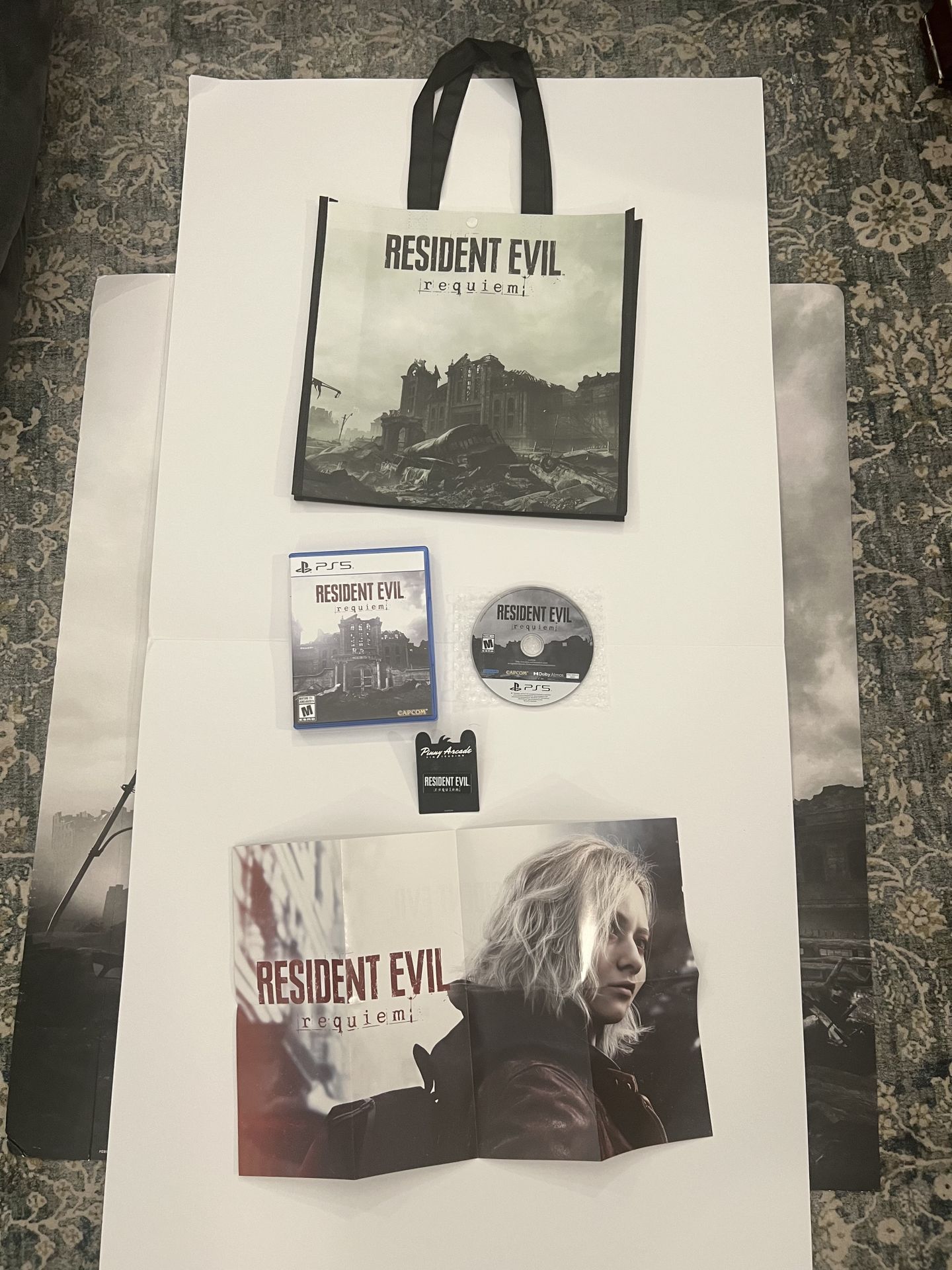 Awesome Resident Evil Requiem bundle for PS5. Has the game disc in its case, a cool tote bag, amazon exclusive two sided poster, a Pinny Arcade pin, and GameStop preorder tote. All items in great shape.