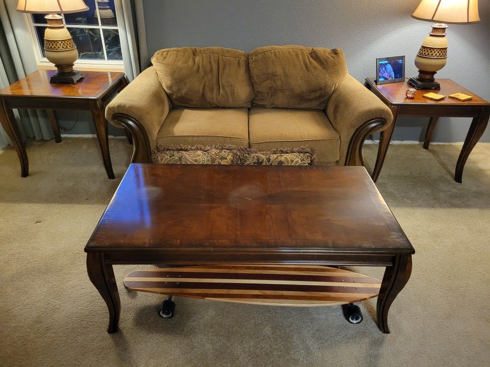 3 Solid wood tables, 2 lamps, chair with ottoman, couch all from ashley. Can deliver within reason